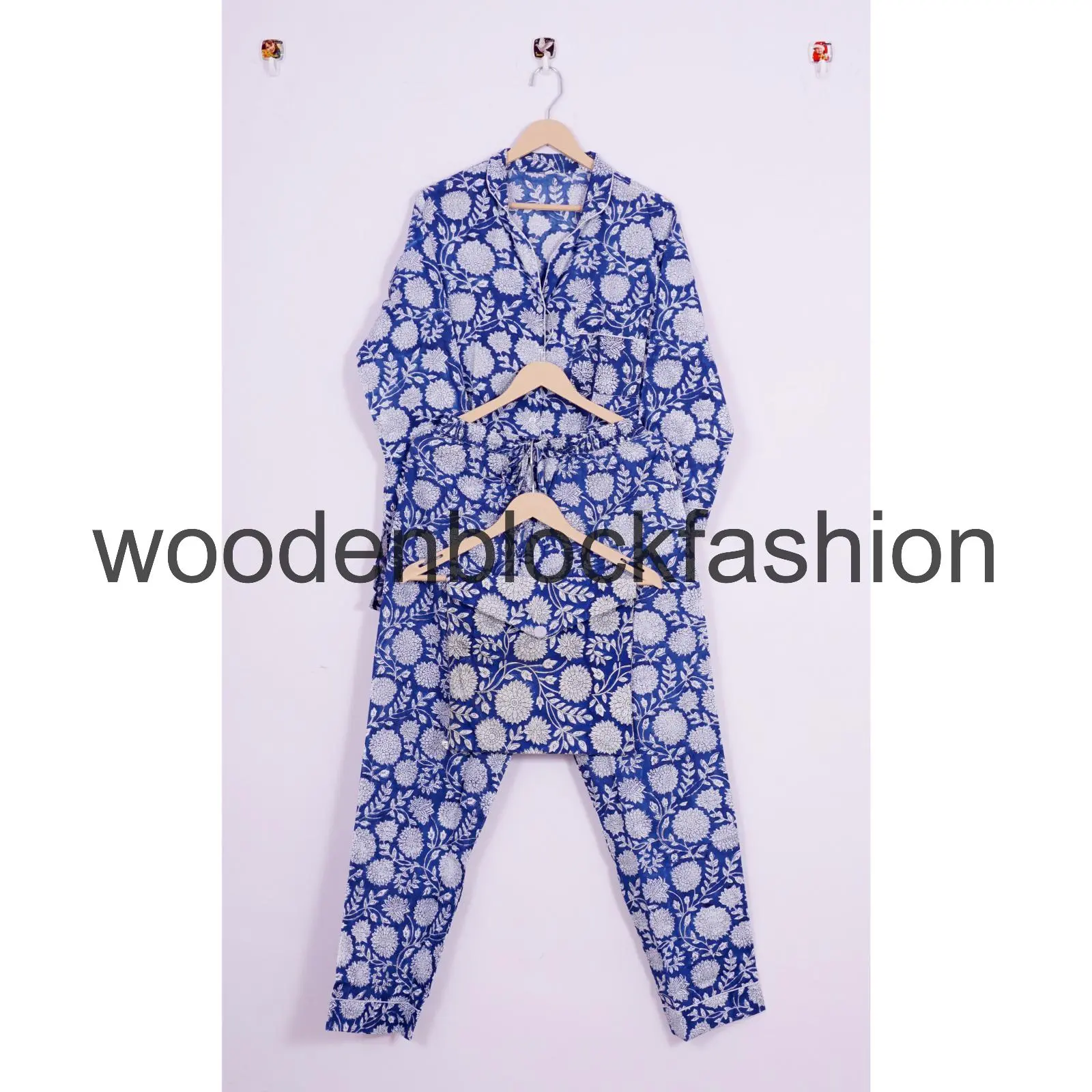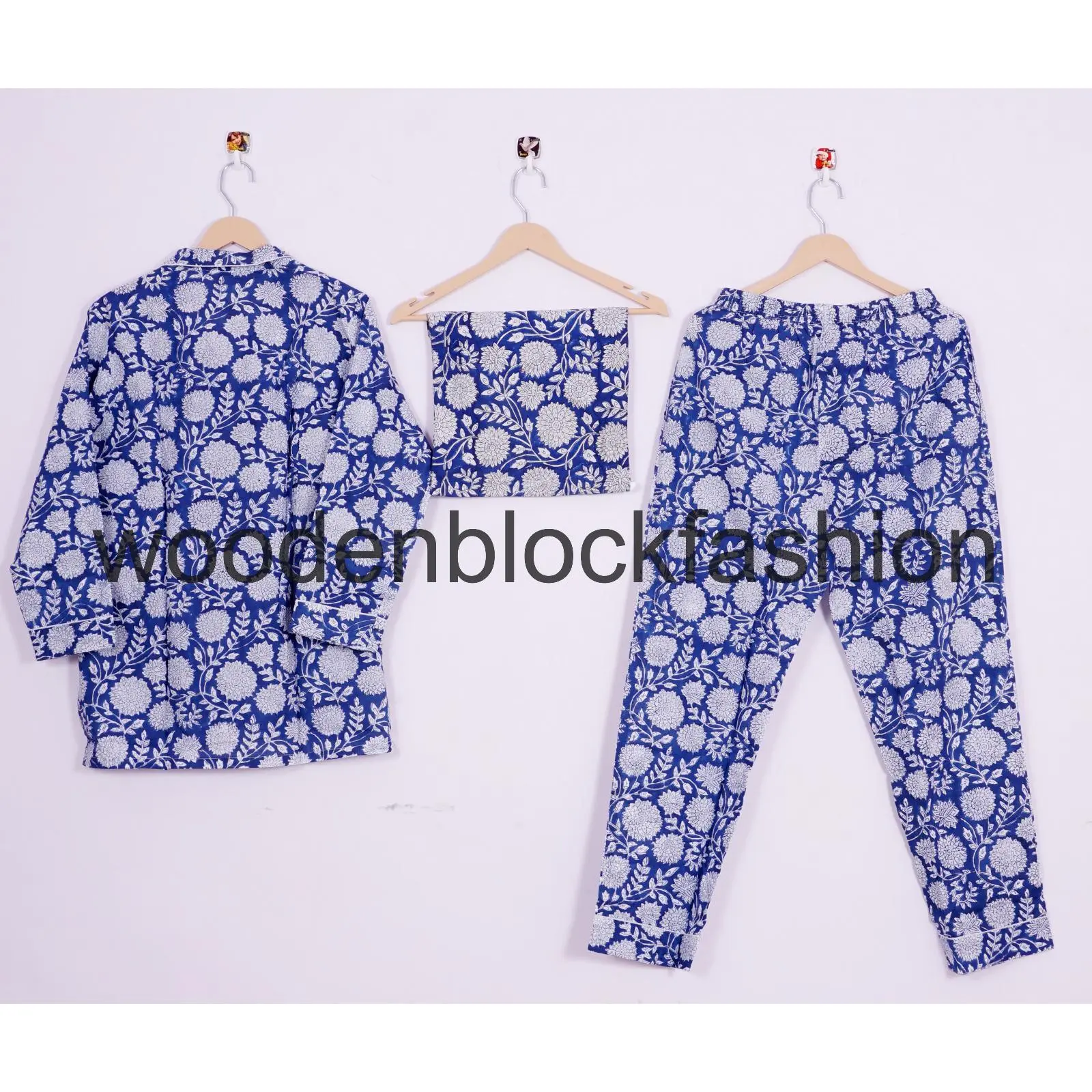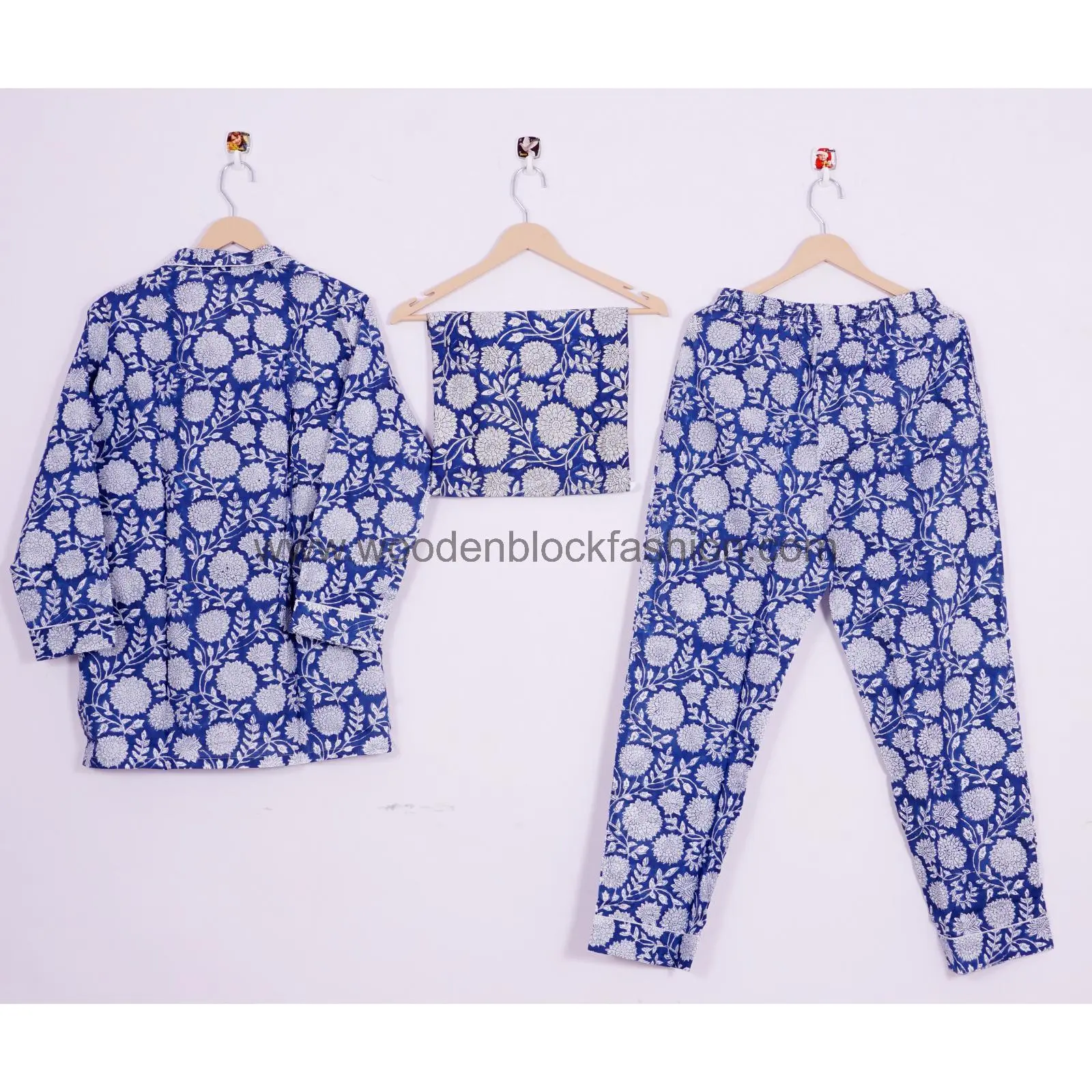 100% Cotton Pajama Set Indian Hand Block Flower Print Night Wear Suit
