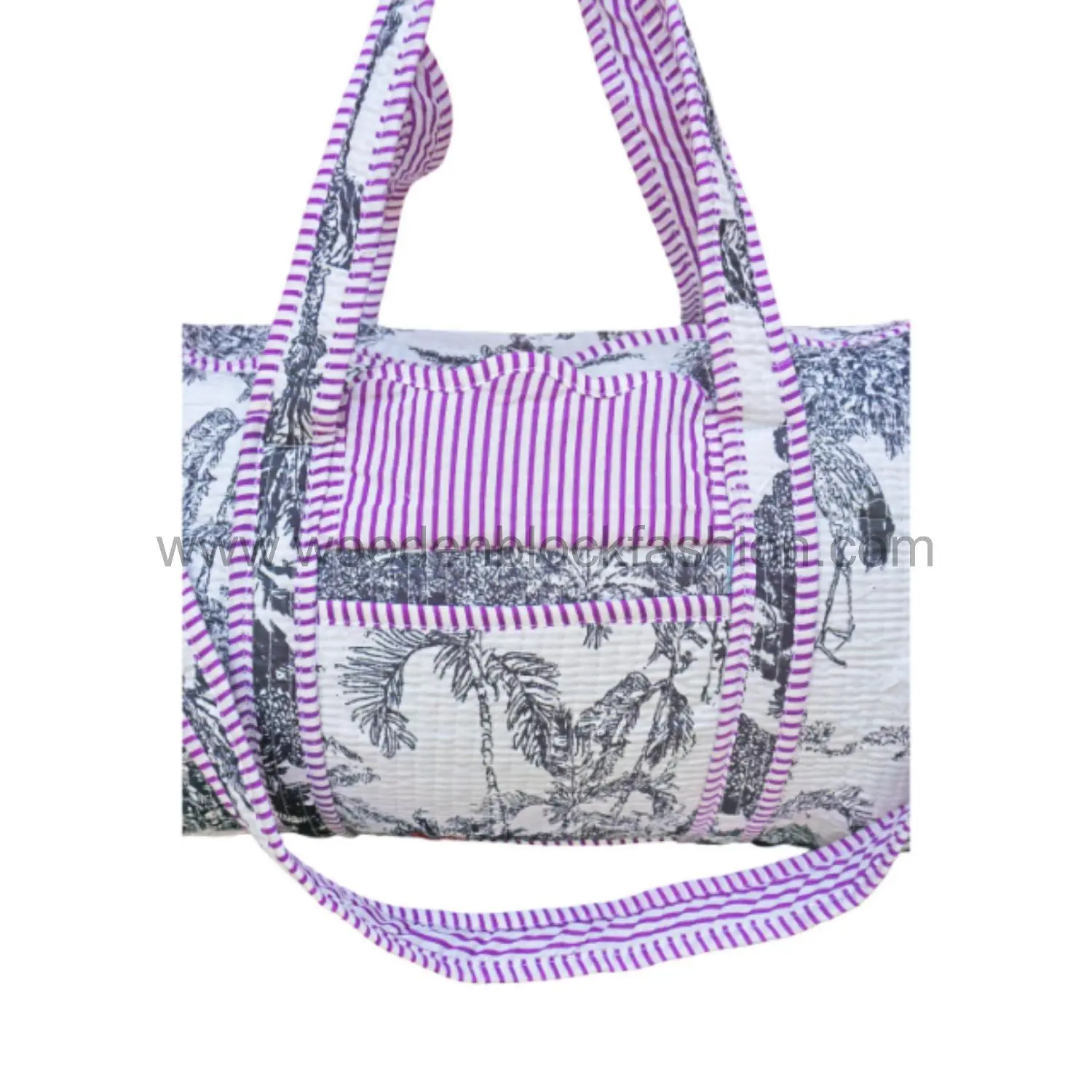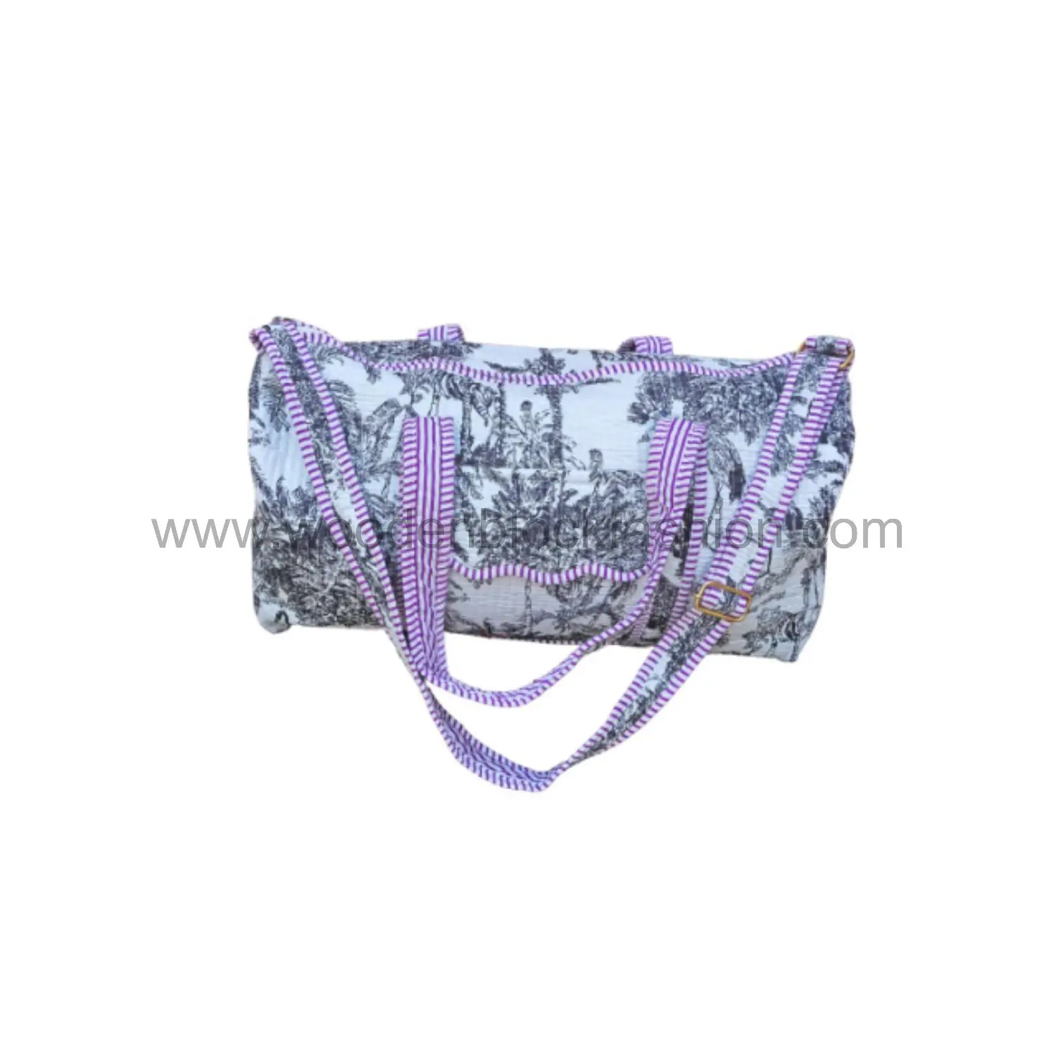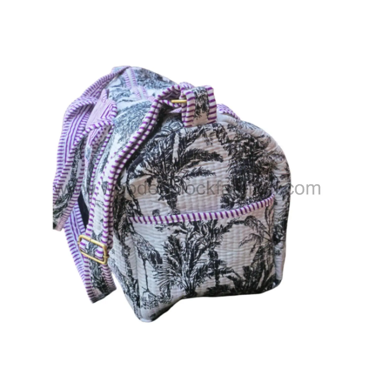 Carry-on ready, this handmade travel duffle is spacious, quilted, and adorned with artisan block prints for a chic look.