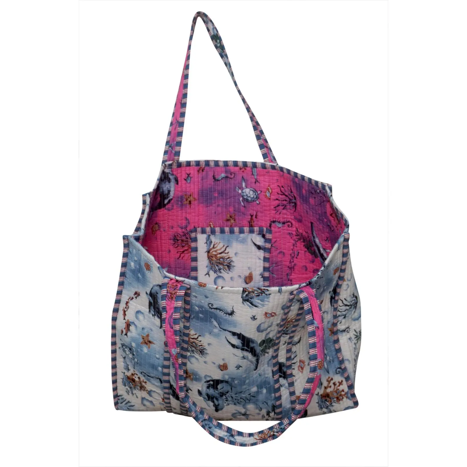 Our block print cotton tote is eco-friendly, versatile, and roomy enough for all your on-the-go needs.