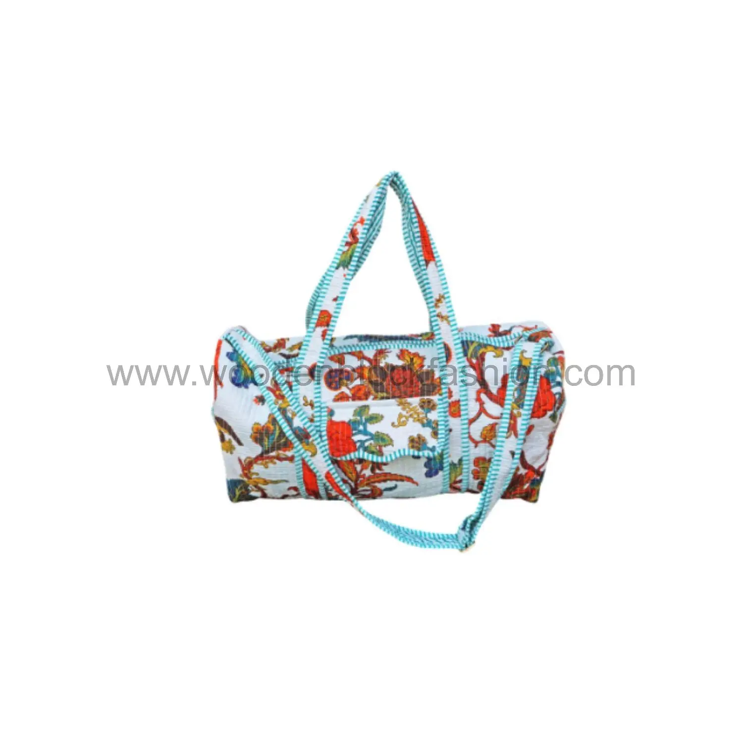 Carry your essentials comfortably with this stylish quilted cotton duffle. Handmade block printing ensures every bag is one-of-a-kind.