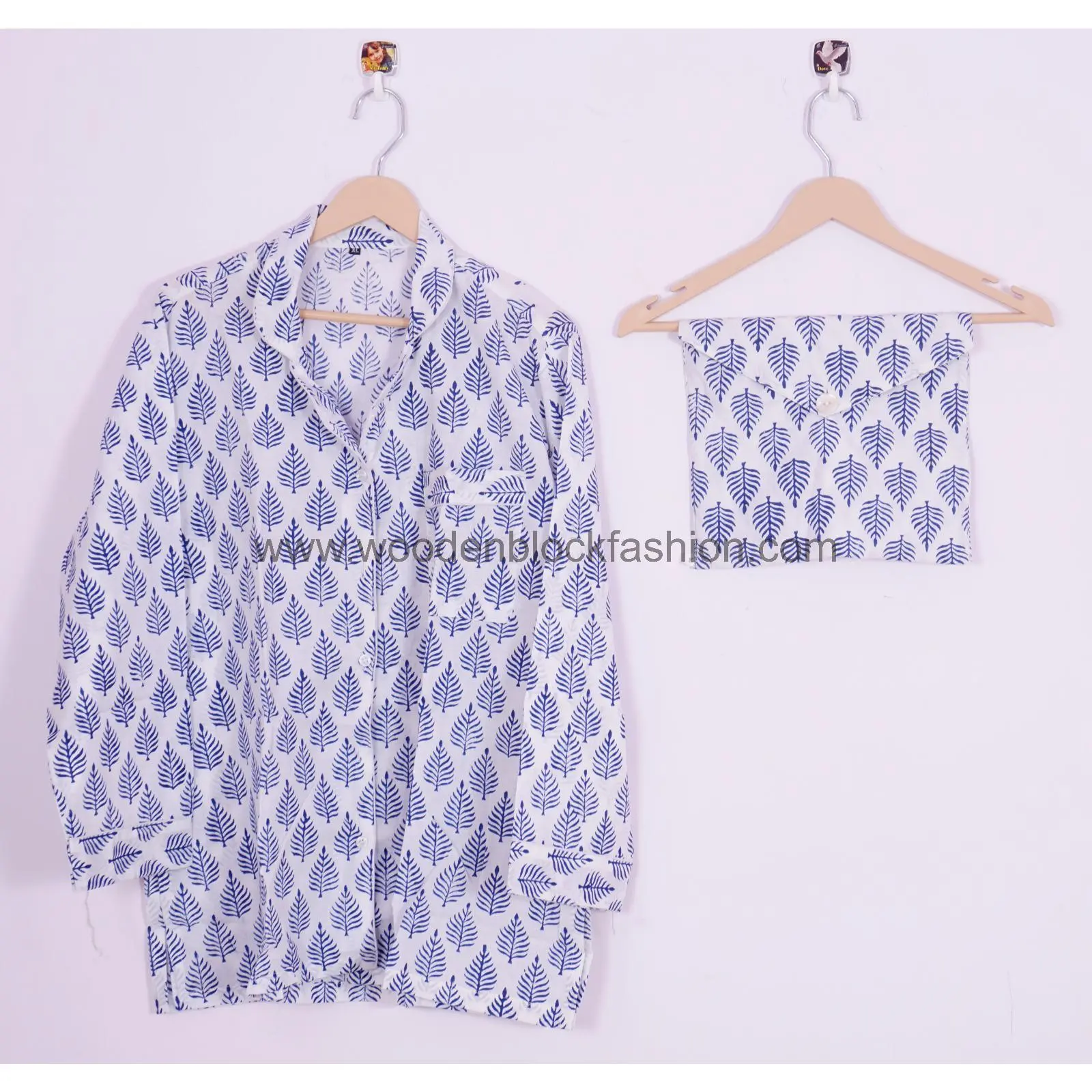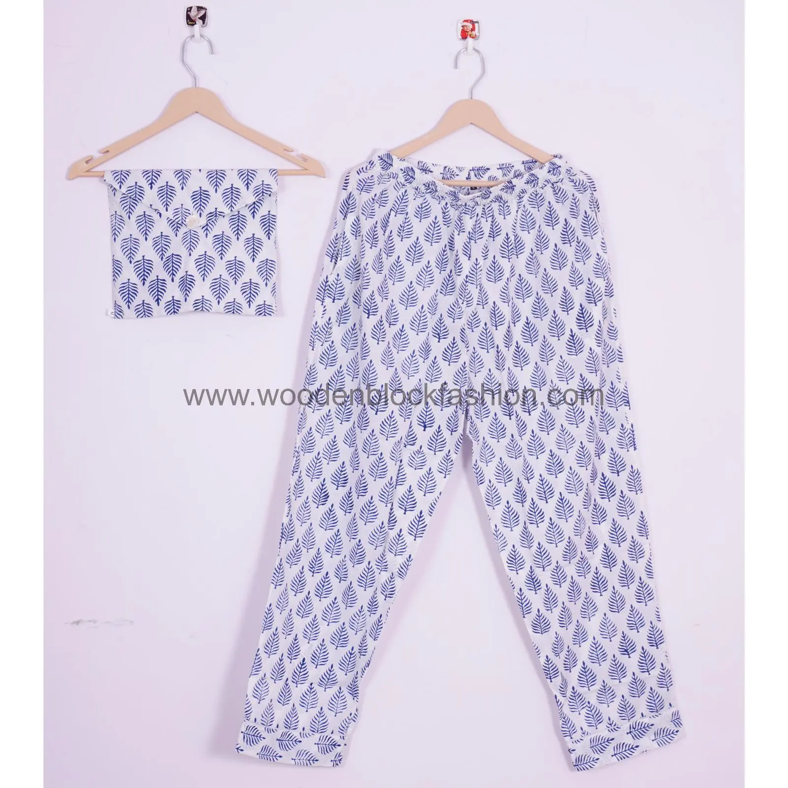 Hand Block Leaf Printed Cotton Pajama Set, Indian Summer Night Suit