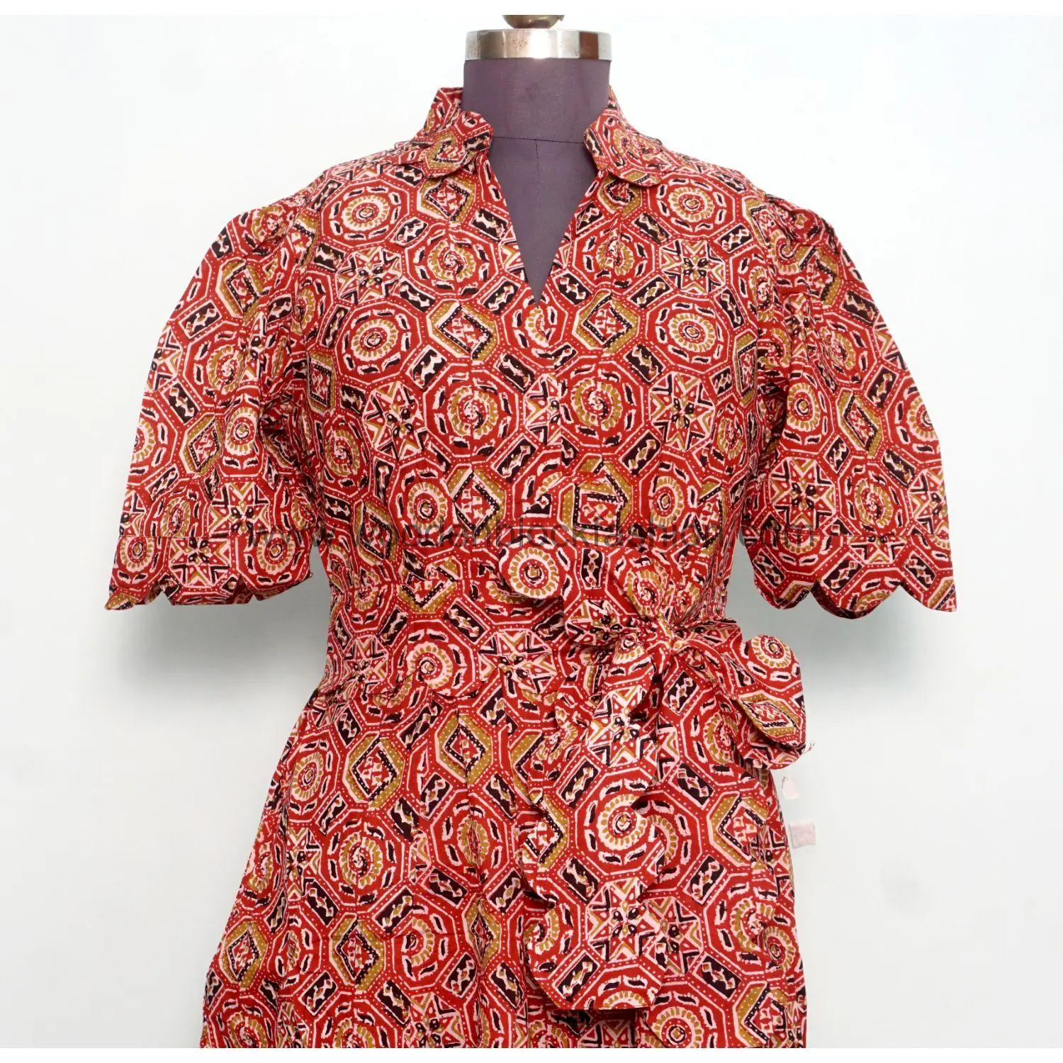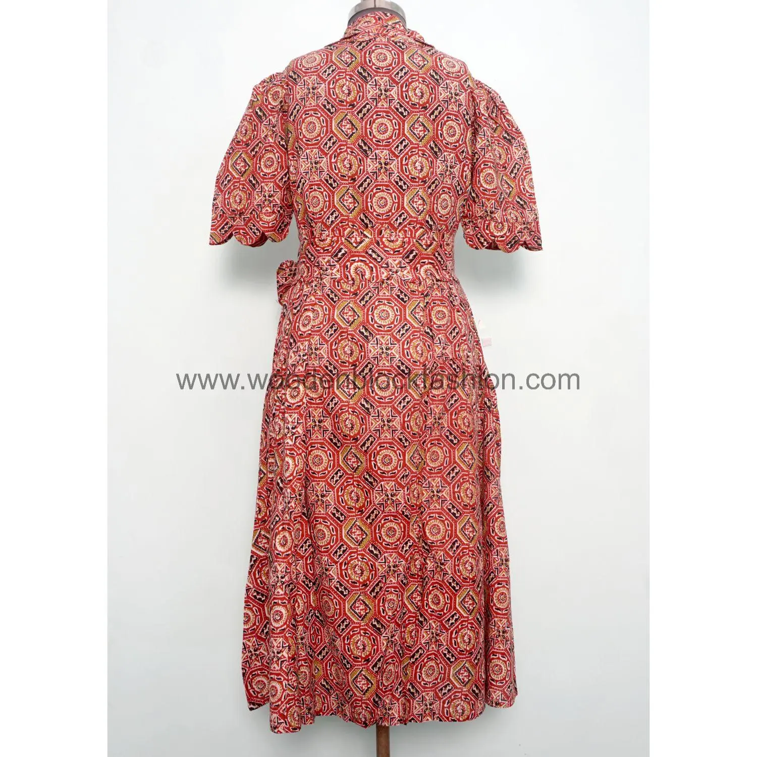 Floral cotton midi dress featuring decorative buttons, V-neck style, and easy-care fabric.