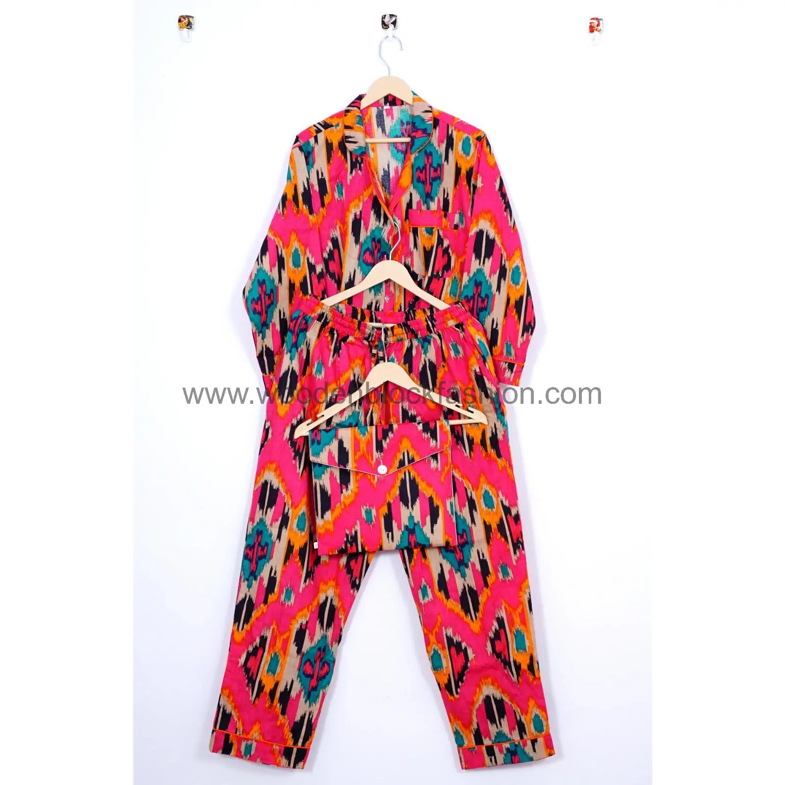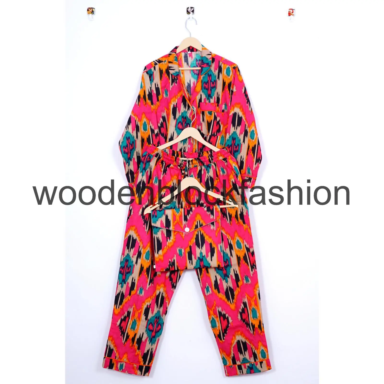 Handblock Ikat Print Cotton Pajama Set, Soft Summer Nightwear, Bridesmaid Gift