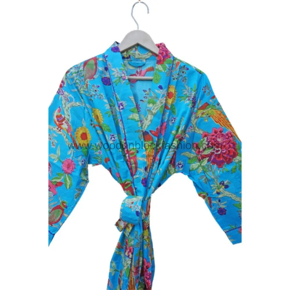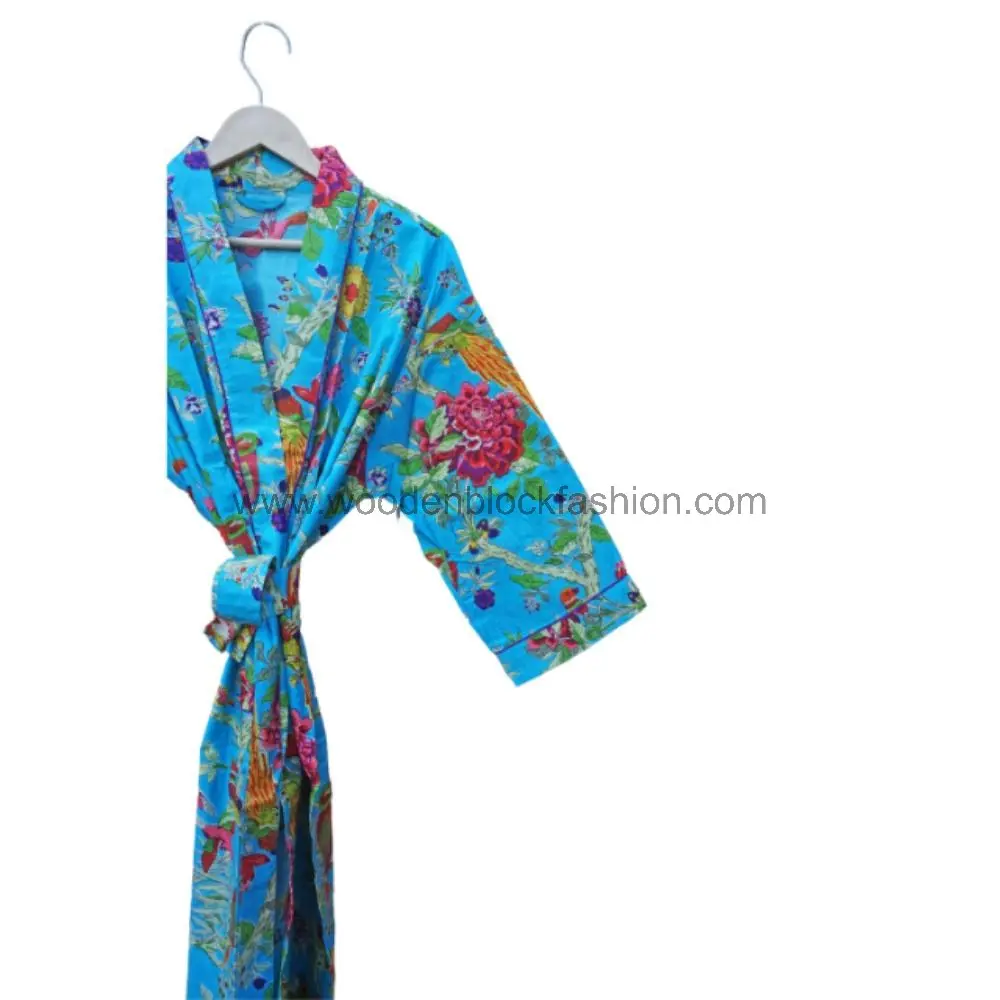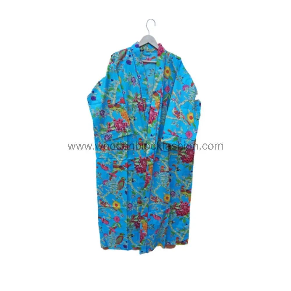 Women’s Cotton Kimono Bathrobe, Hand Block Printed Long Robe