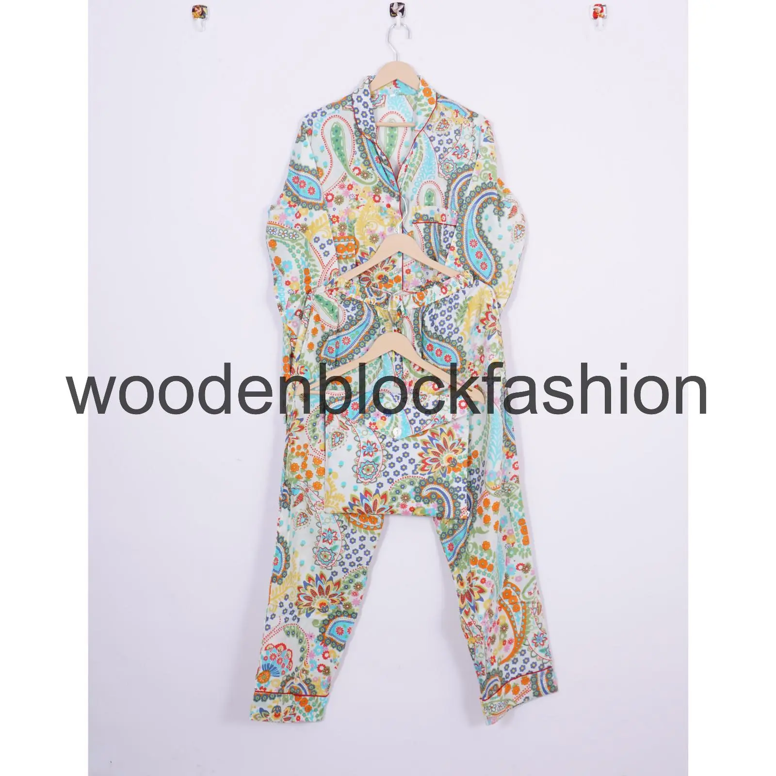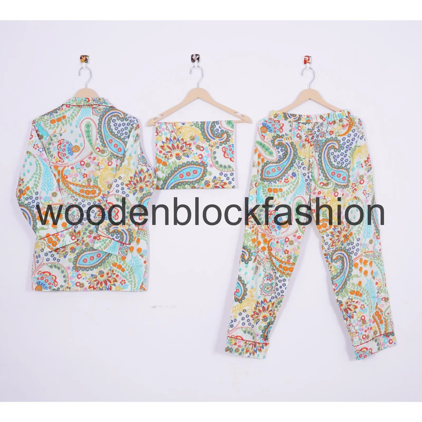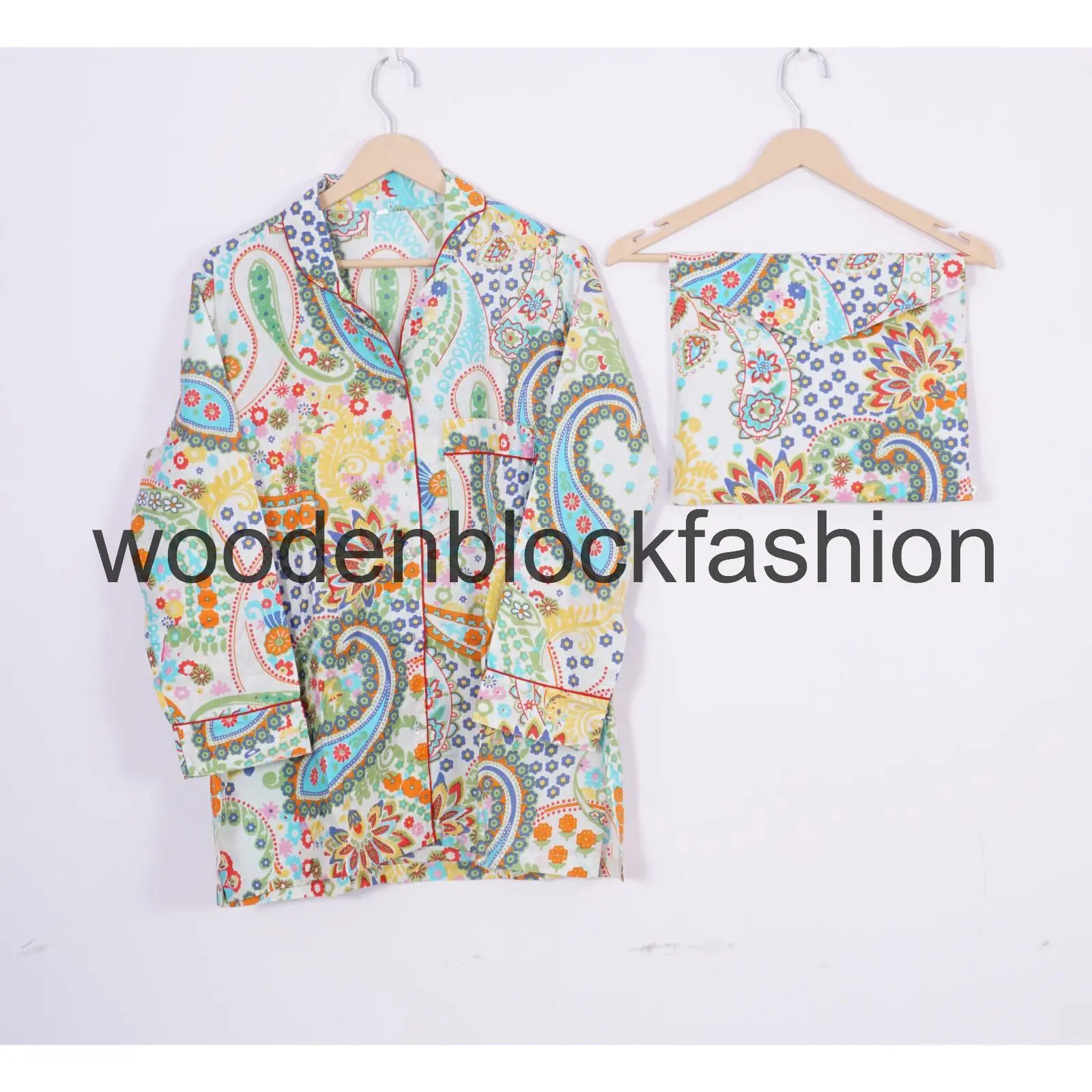 Women's Block Print Cotton Pajama Set, Paisley Printed Bohemian Loungewear Pjs