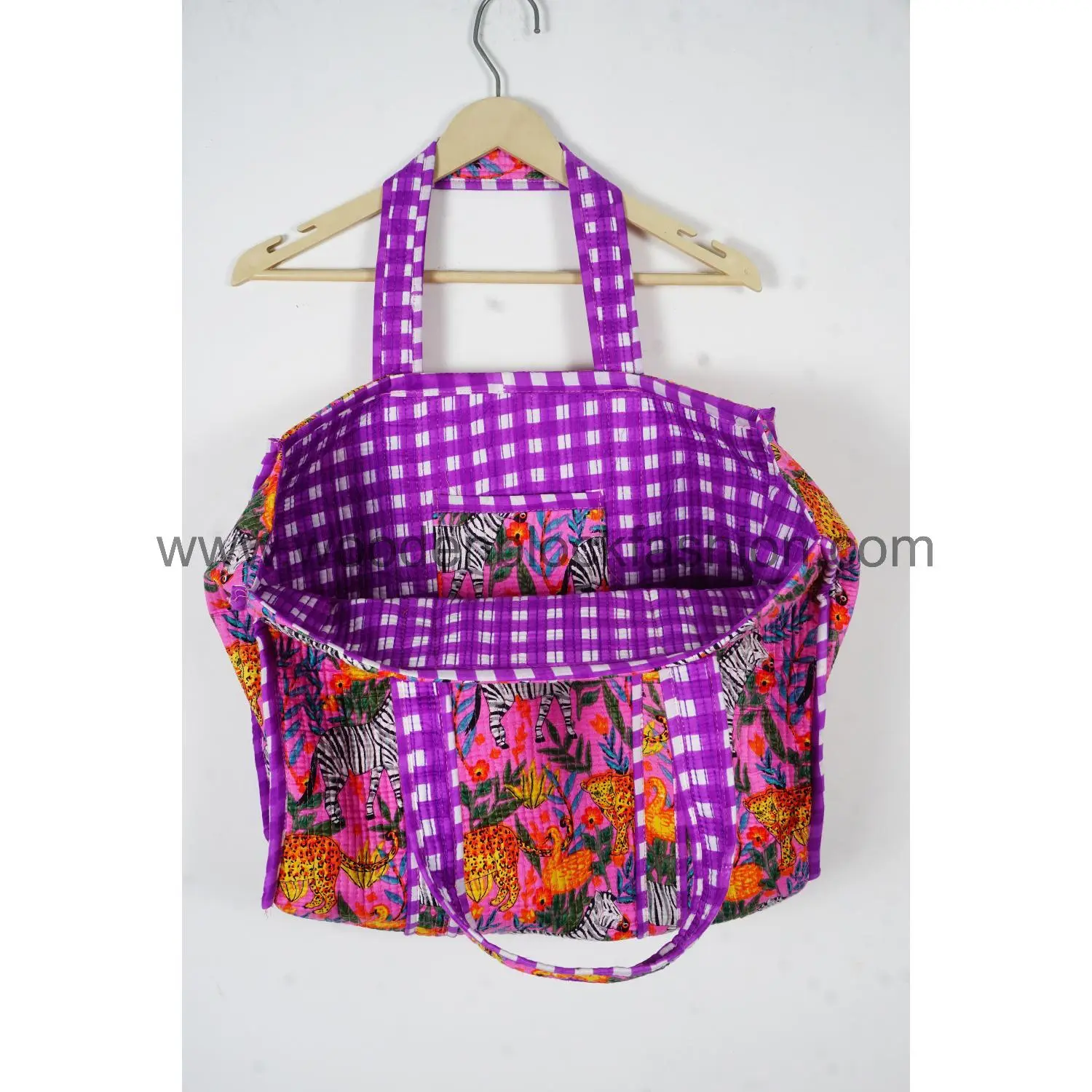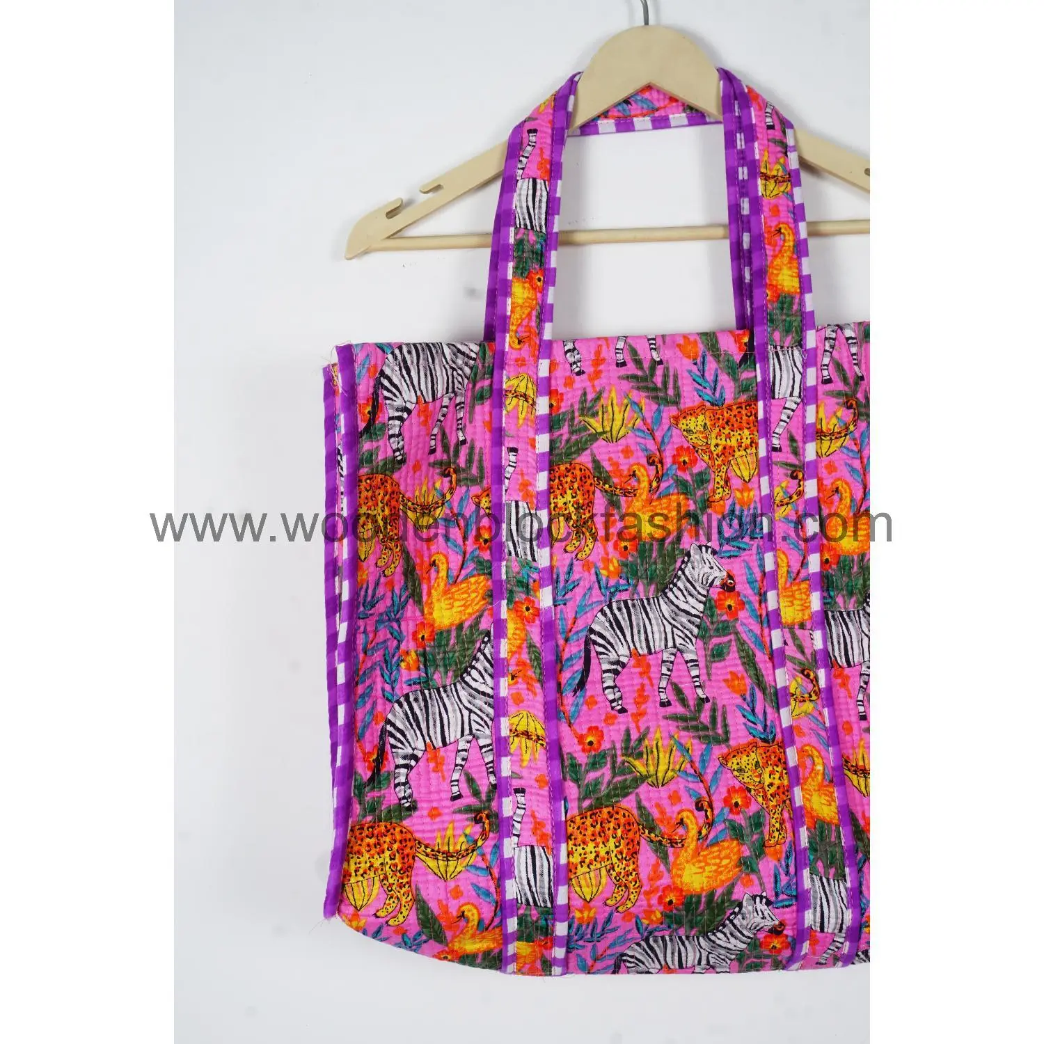 Crafted from natural cotton, this eco-friendly quilted tote bag features beautiful Indian block printing and long handles for comfort.