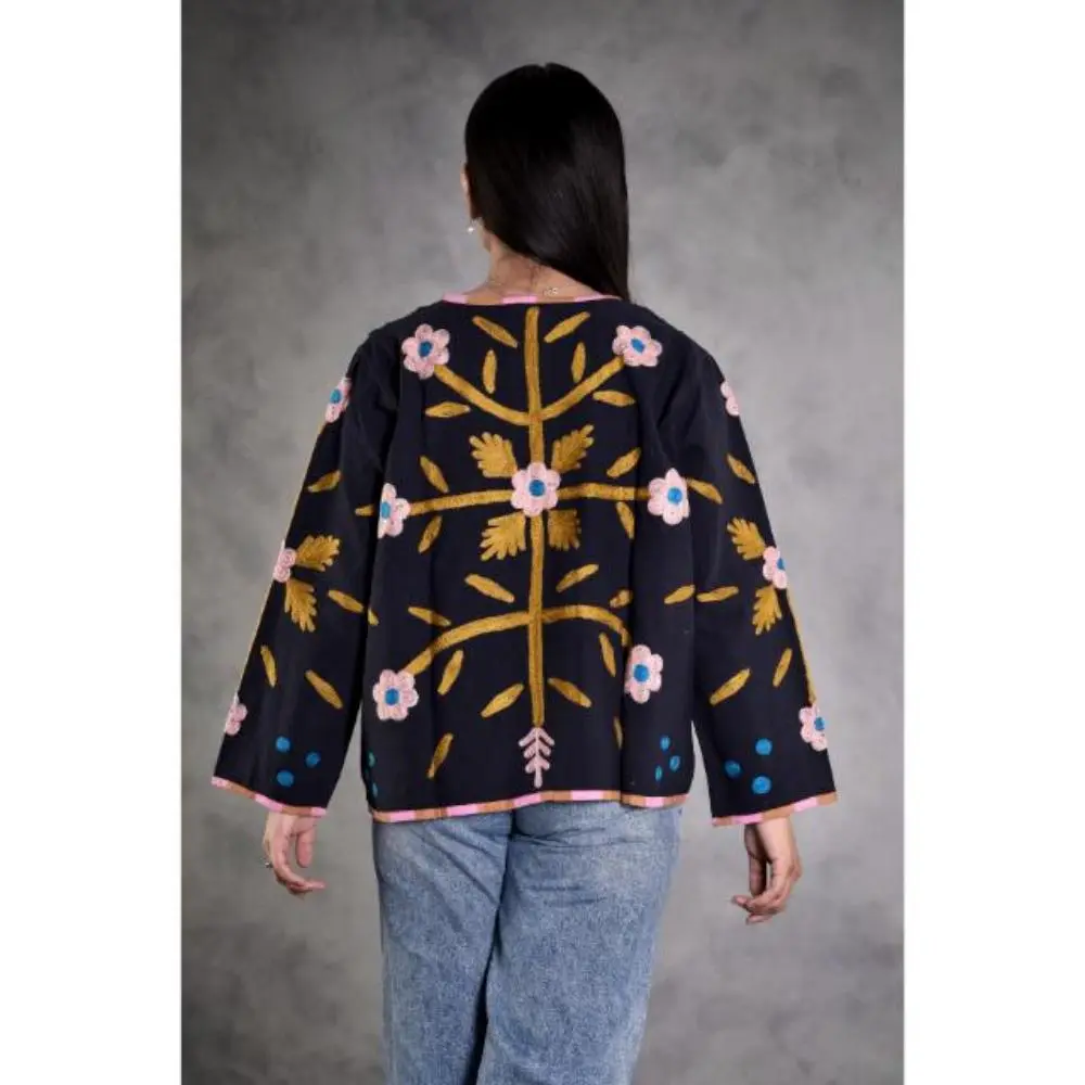 A timeless piece, this hand-embroidered Suzani jacket blends heritage artistry with everyday elegance.