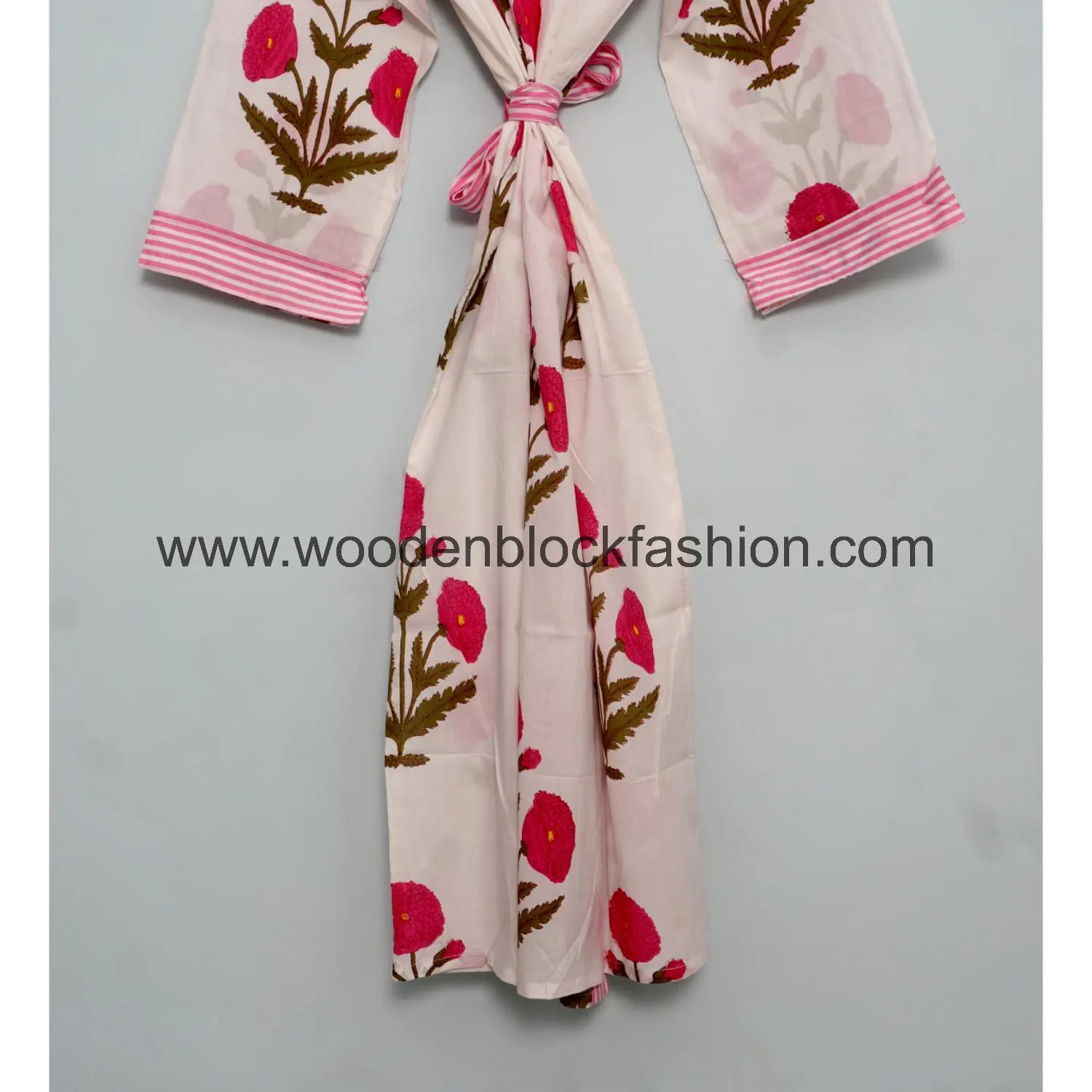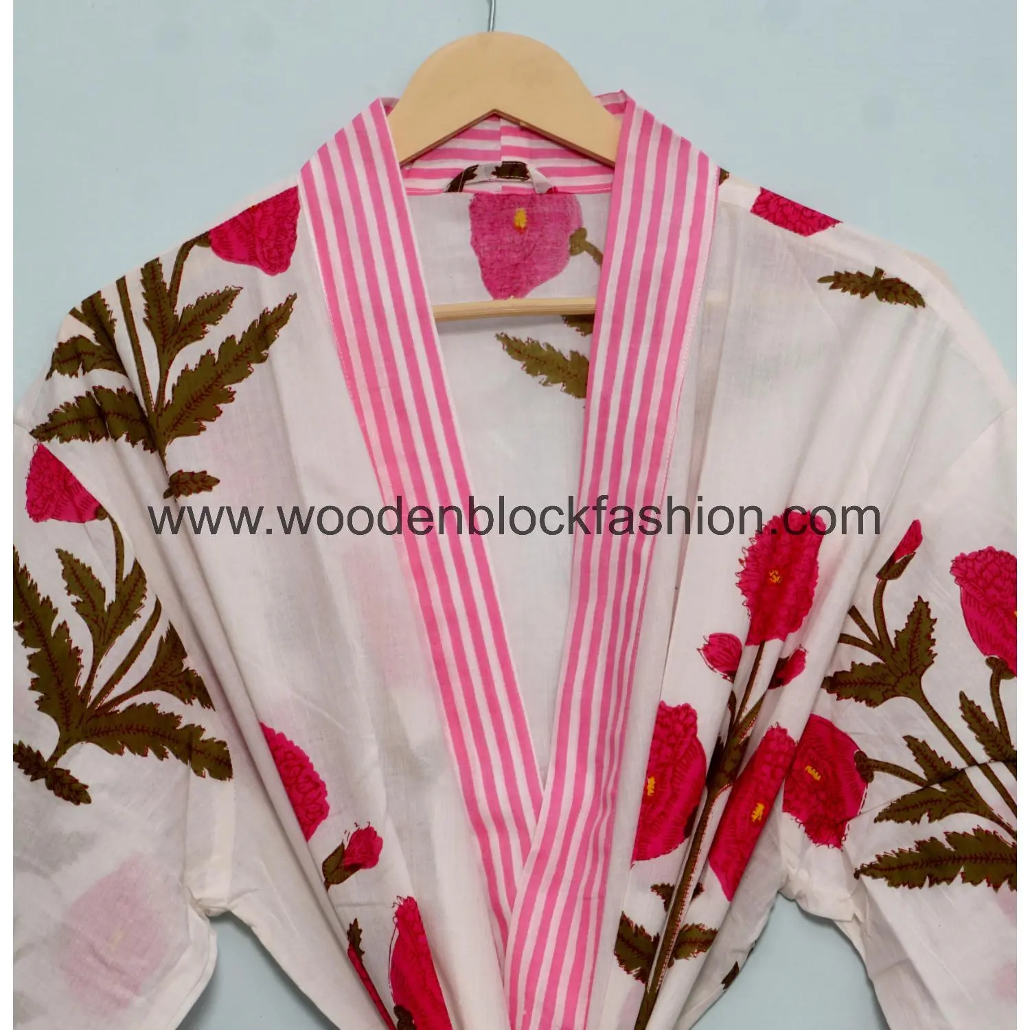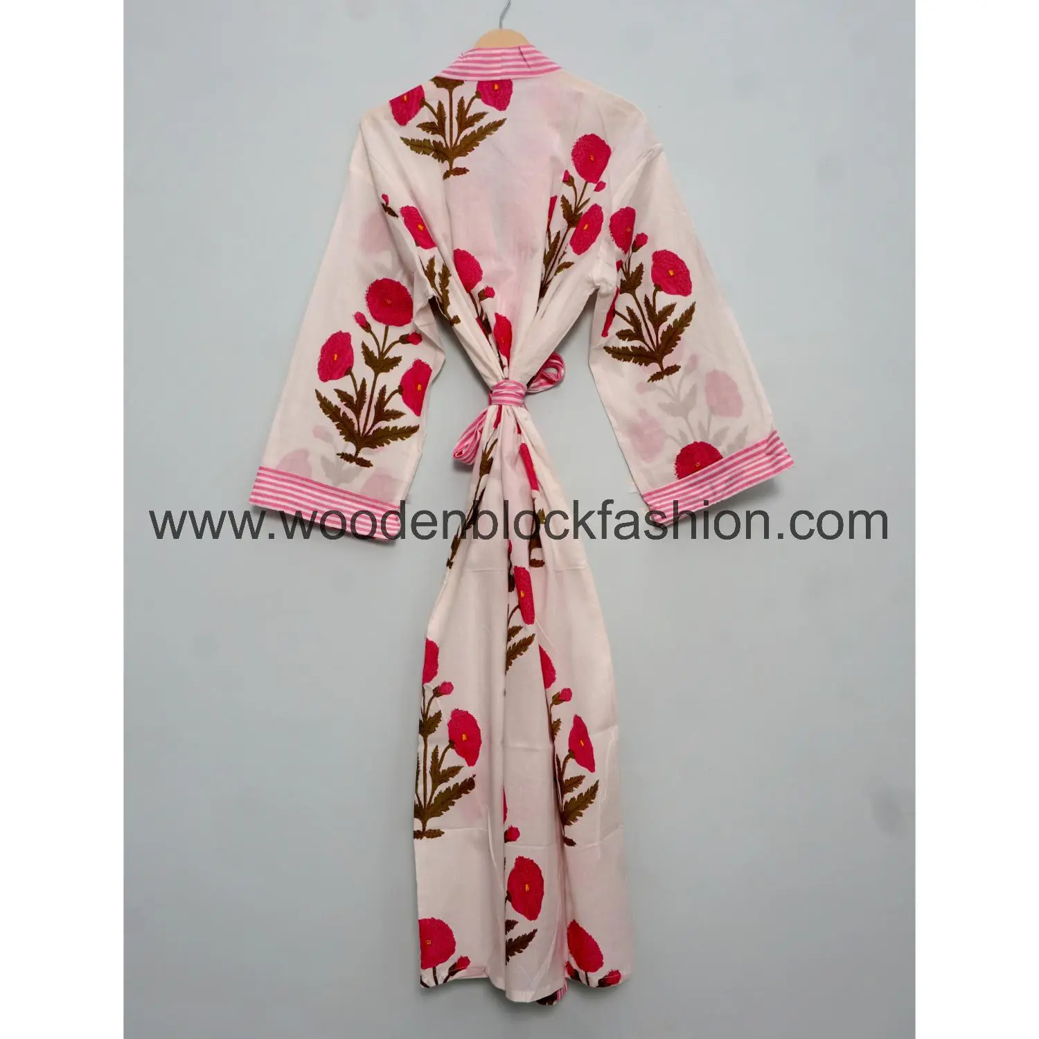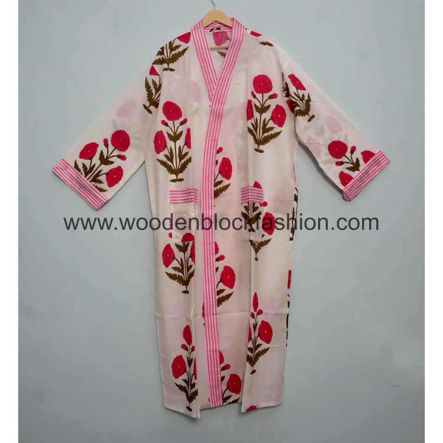 This floral kimono is made from lightweight cotton and features classic block printing. Comfortable and stylish for everyday home use.