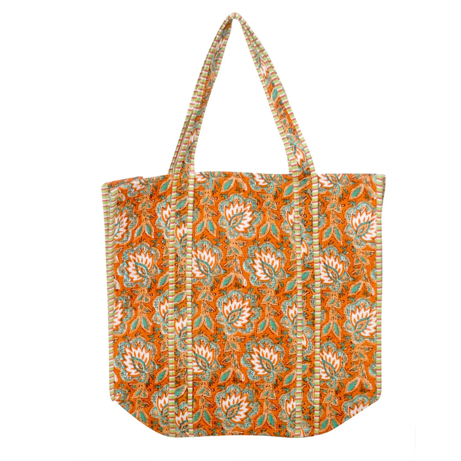 This hand block print cotton tote bag features floral patterns and is perfect for eco-friendly shopping.