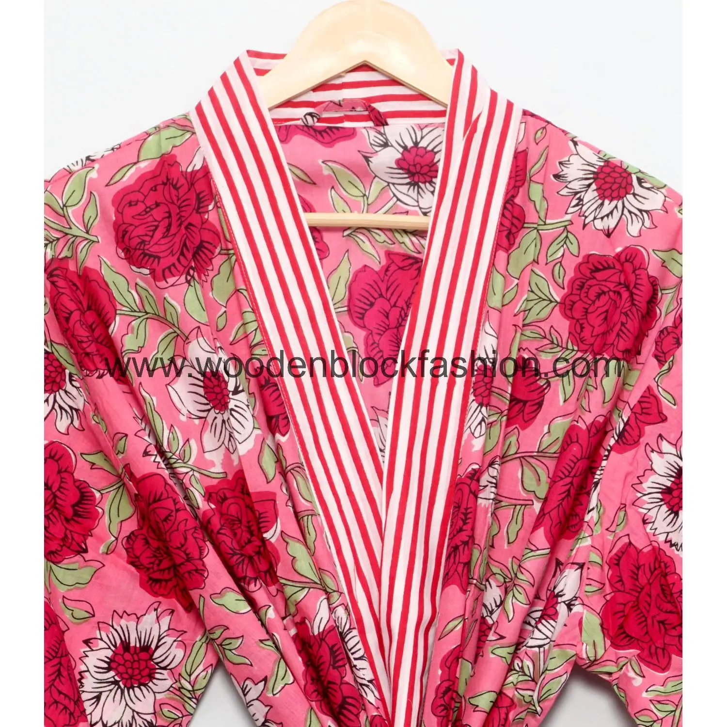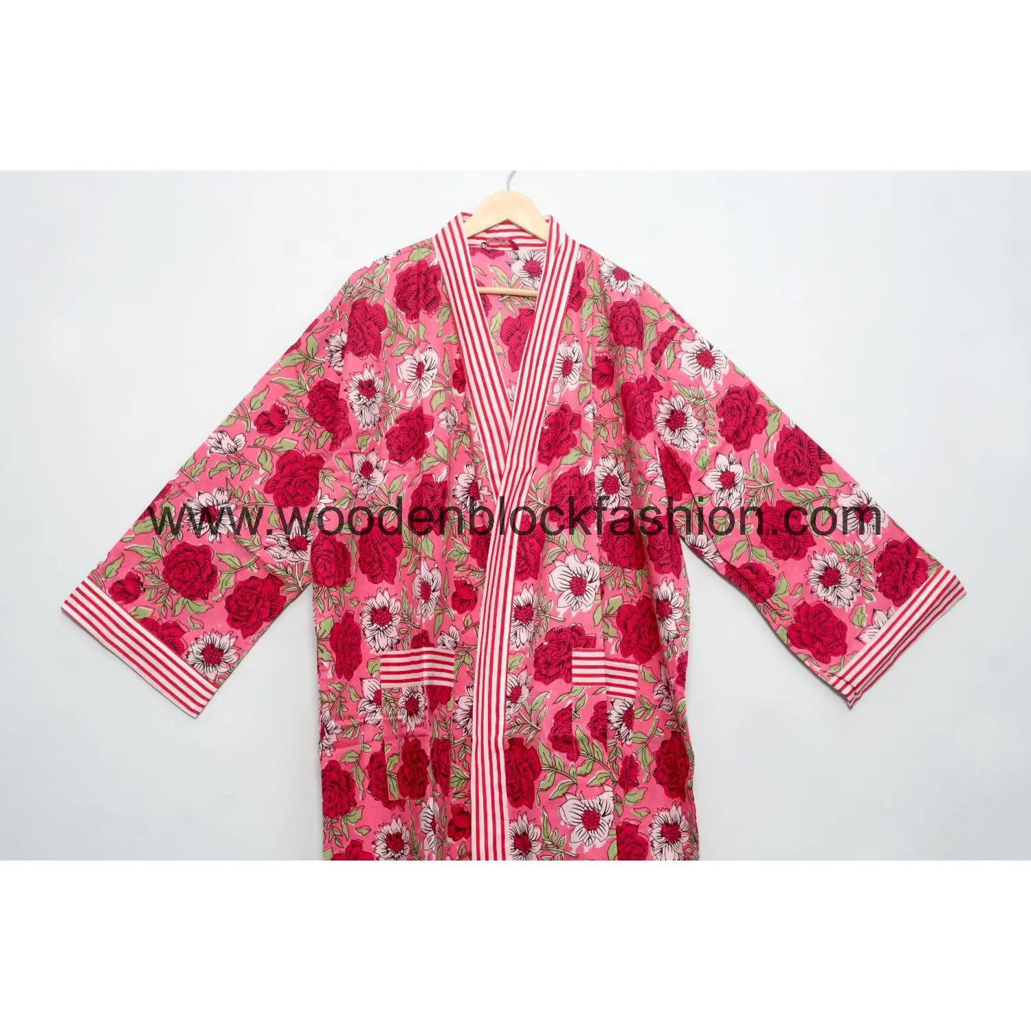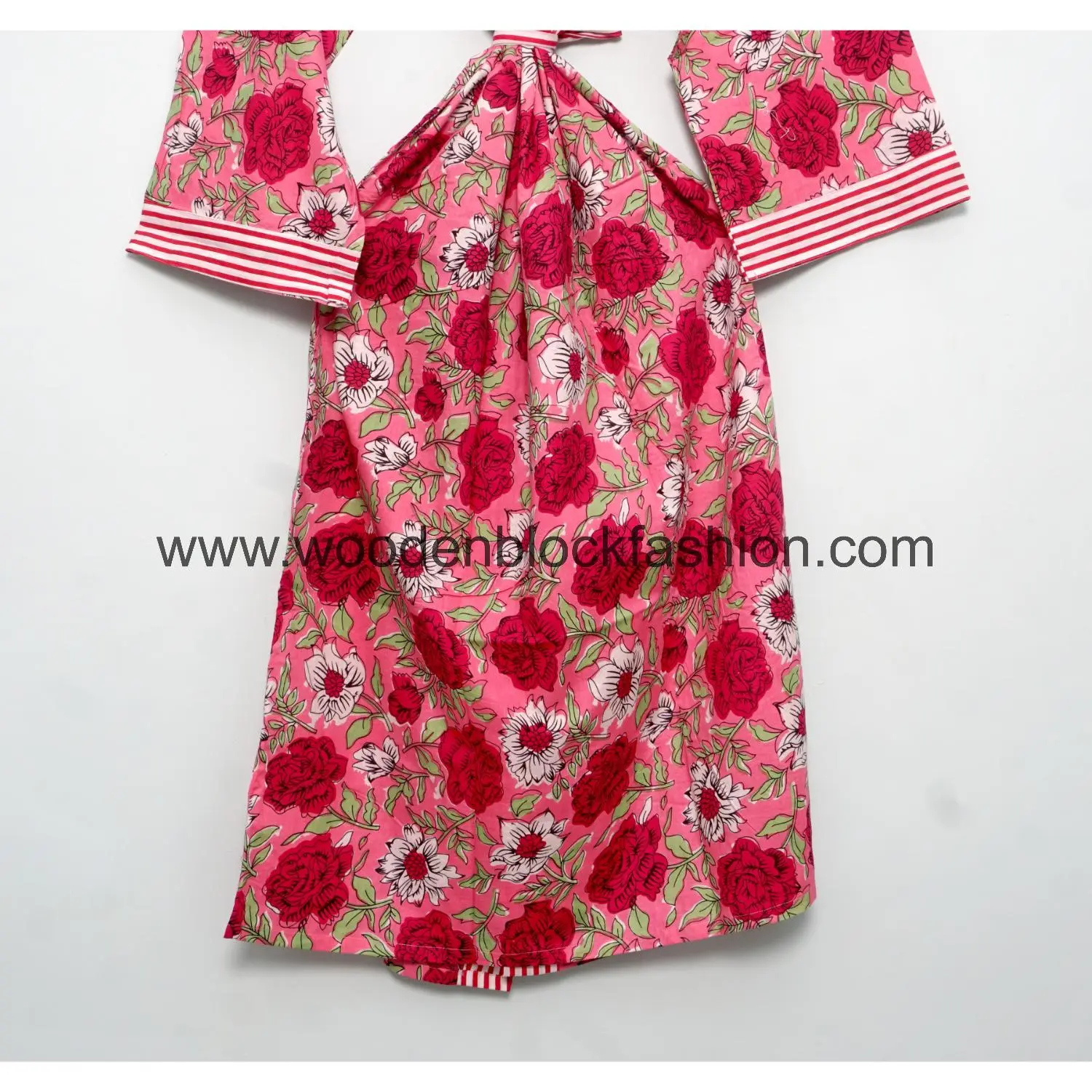 This cotton lounge robe is crafted using traditional hand block printing techniques. Lightweight and airy, it is suitable for home wear, spa days, or casual layering.