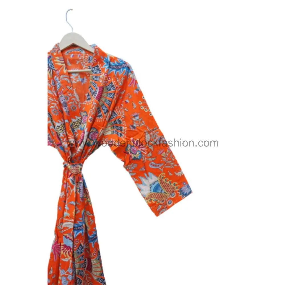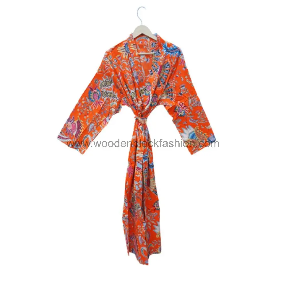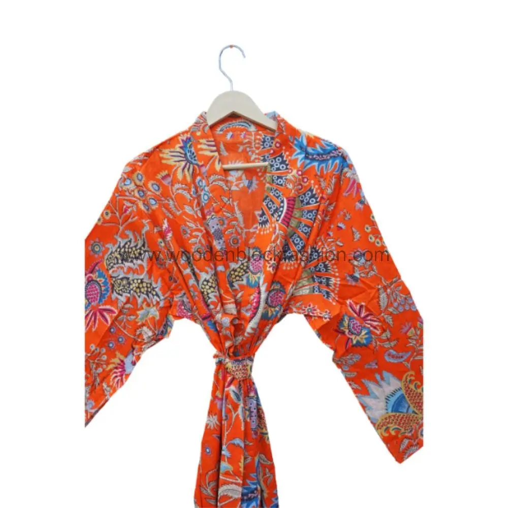 A floral cotton robe designed for summer comfort. The breathable fabric and hand block print make it ideal for warm-weather lounging or as a beach cover-up.