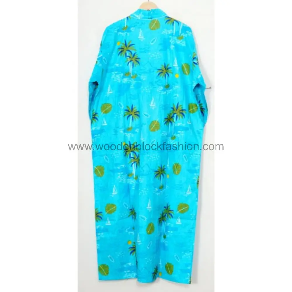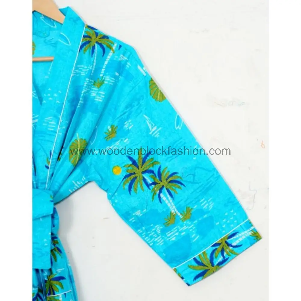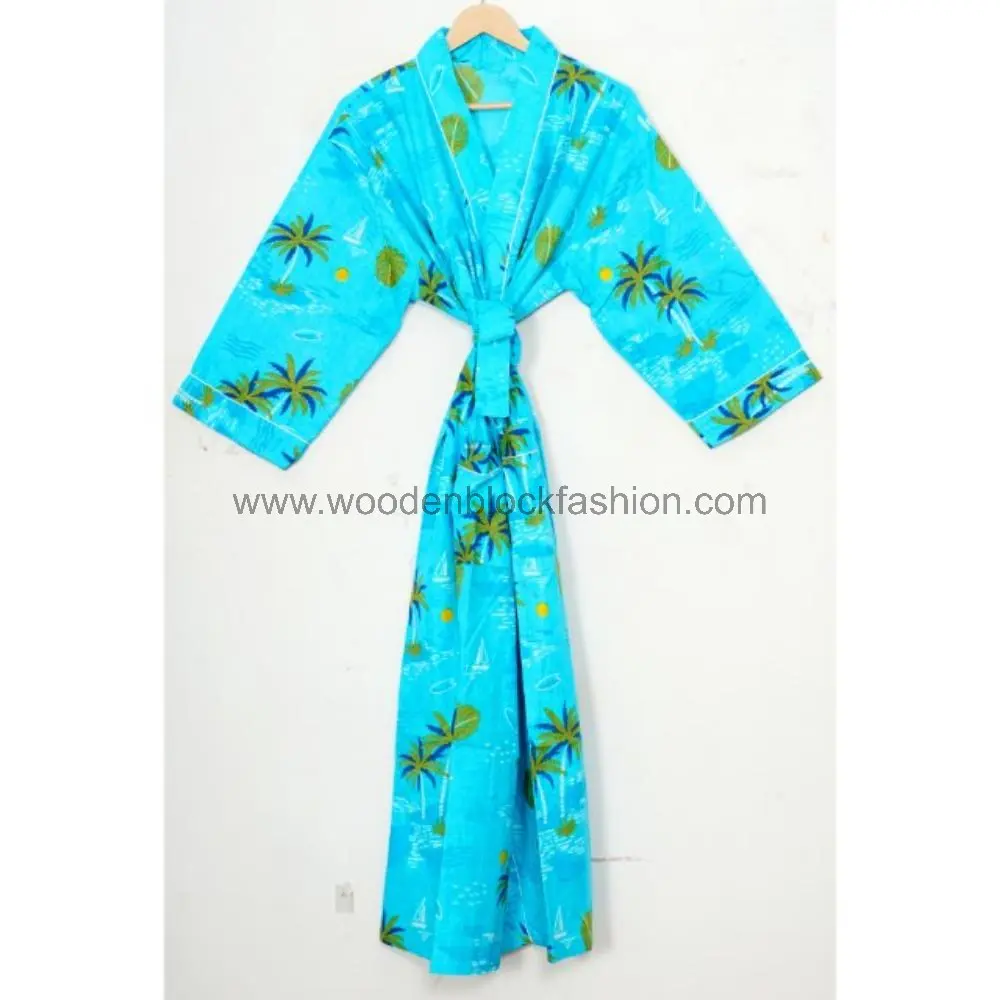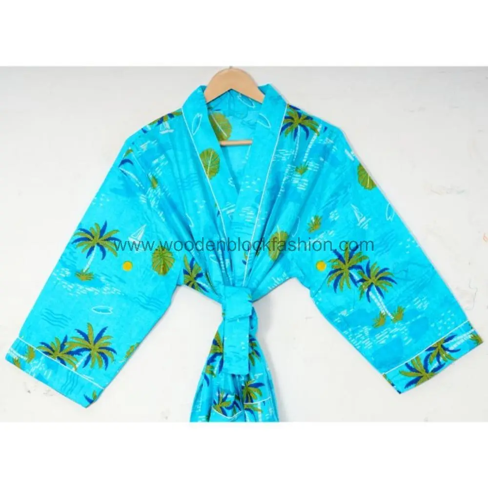 This handcrafted cotton kimono robe features traditional block print patterns and a lightweight feel, ideal for summer comfort.