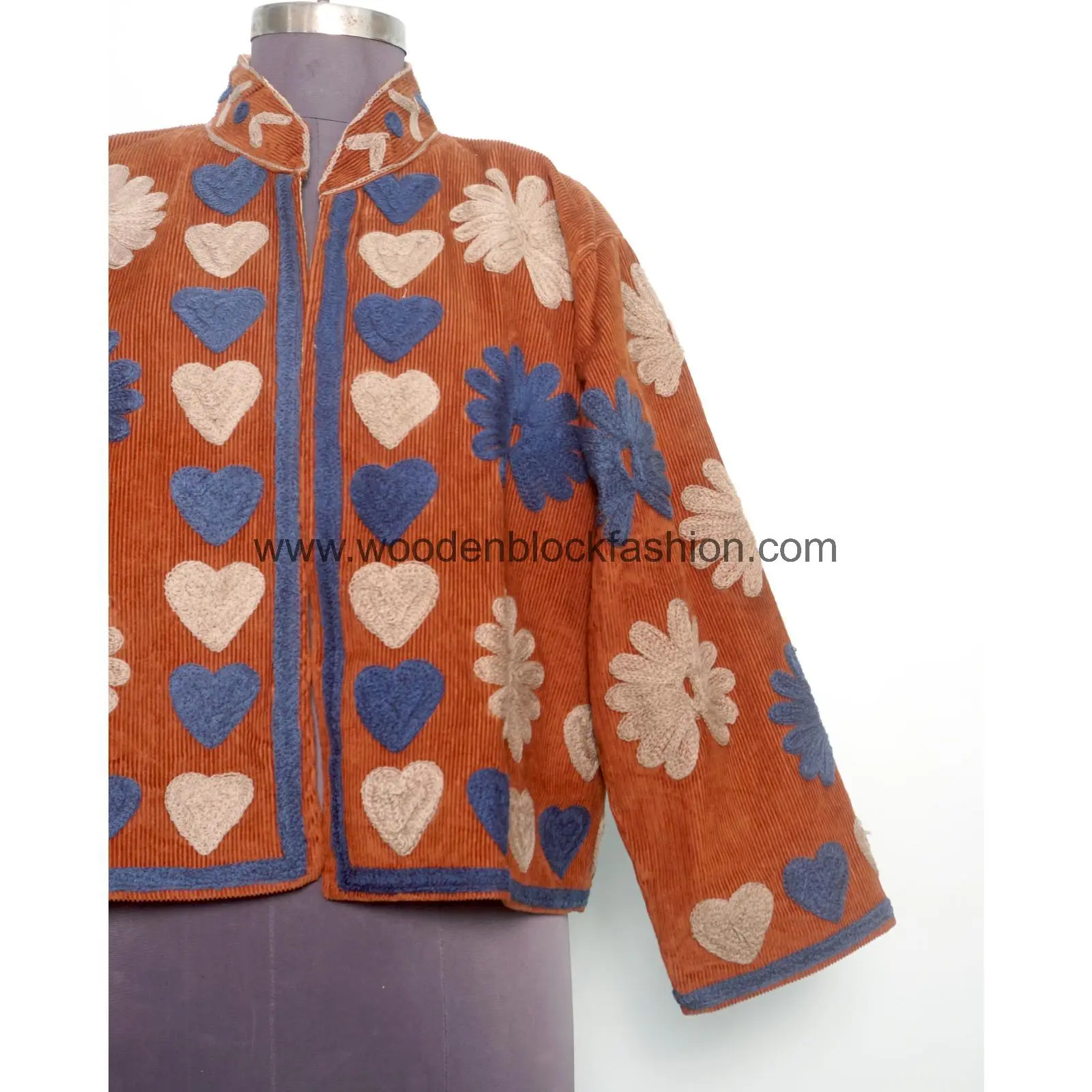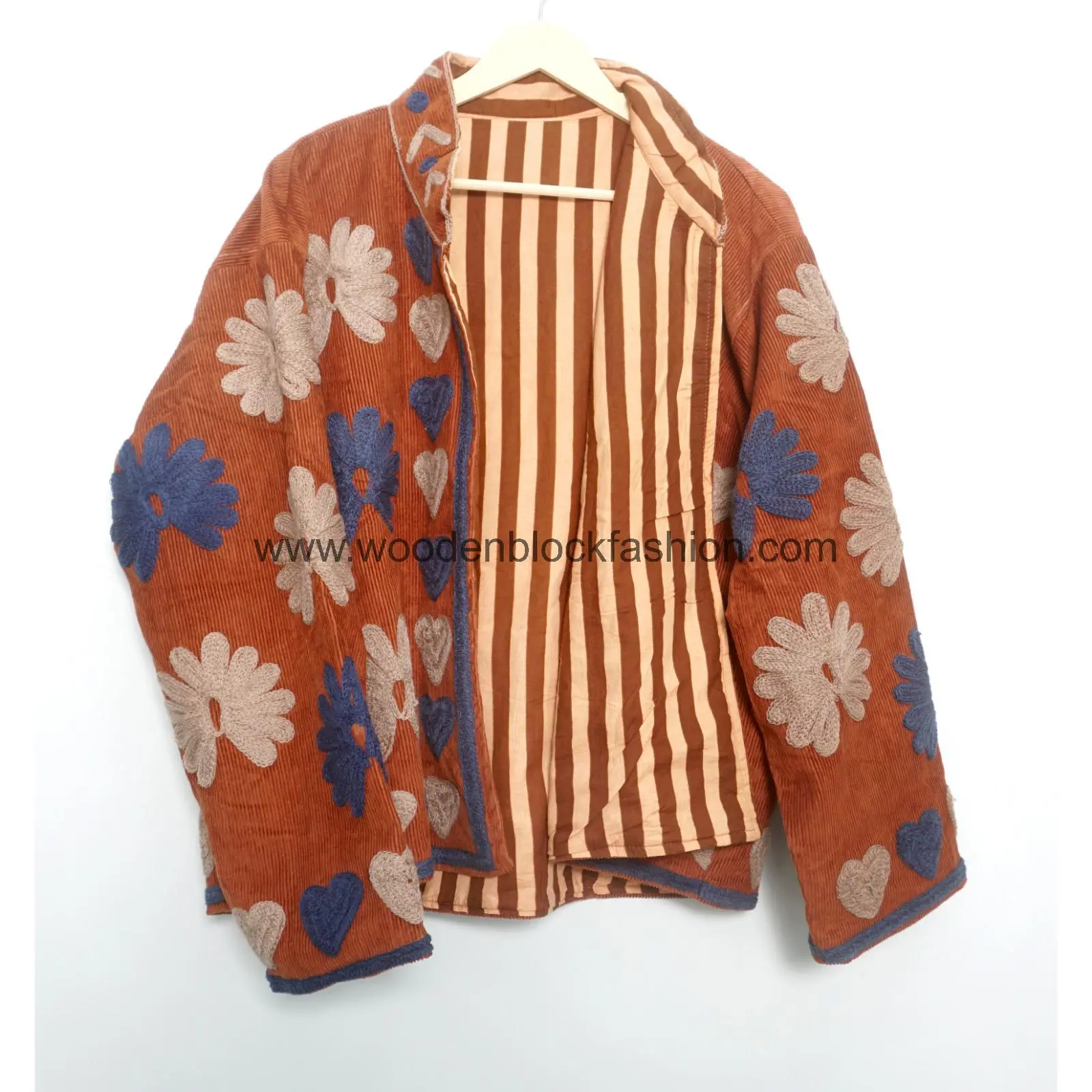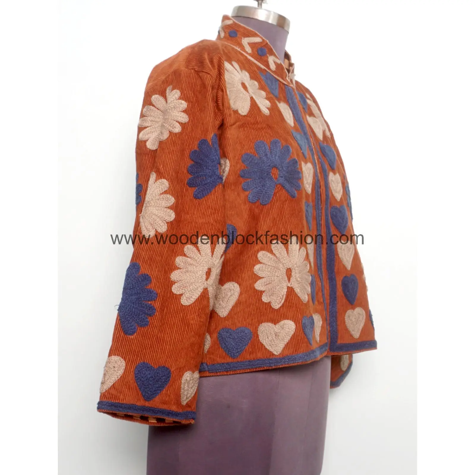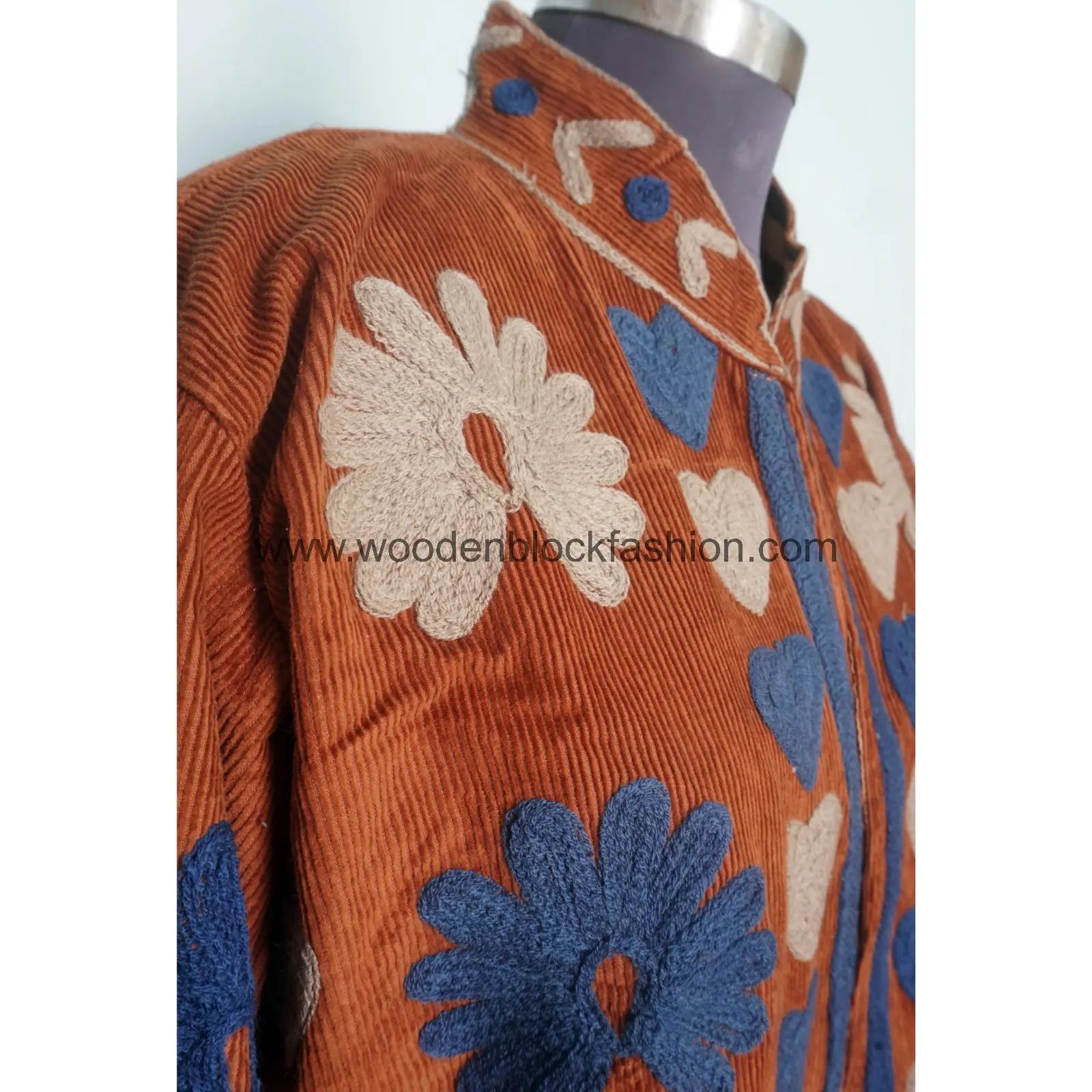 This handcrafted Suzani embroidered cotton bomber jacket showcases traditional artistry with a modern boho silhouette, making it a timeless statement piece.