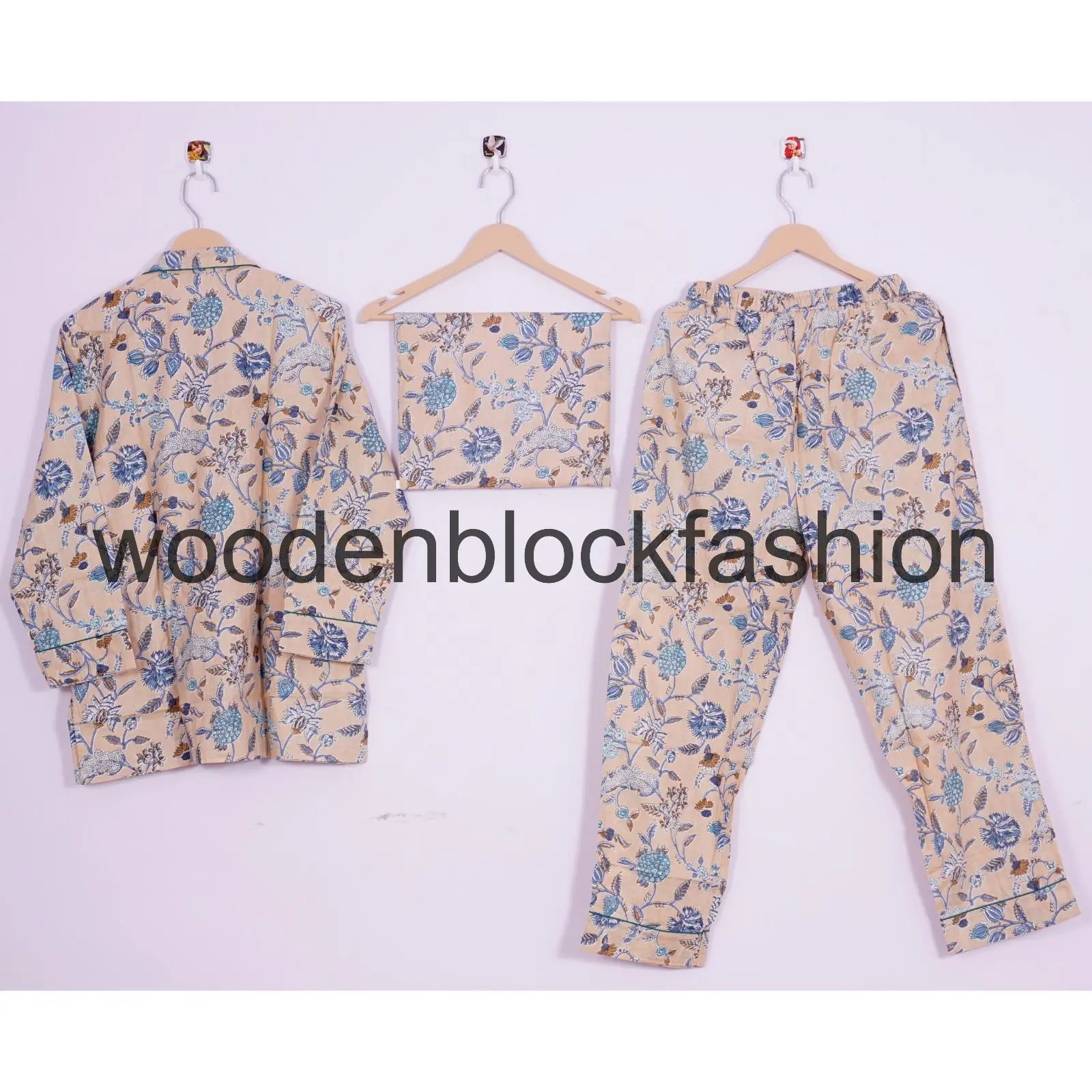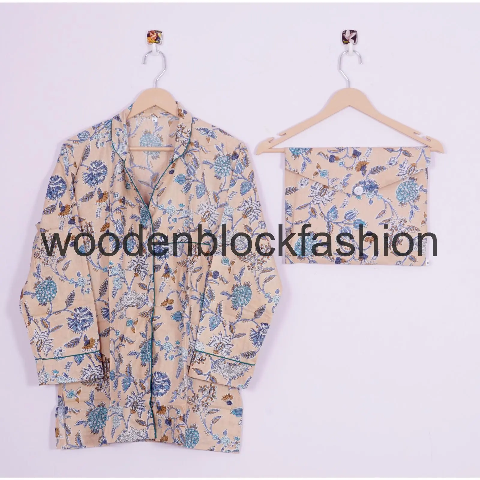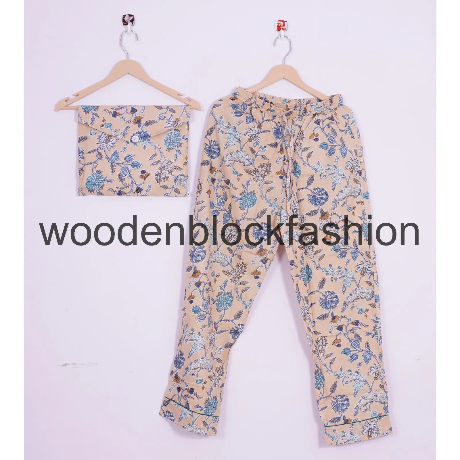 100% Cotton Pajama Set Indian Hand Block Flower Print Night Wear Suit Shirt Payjama