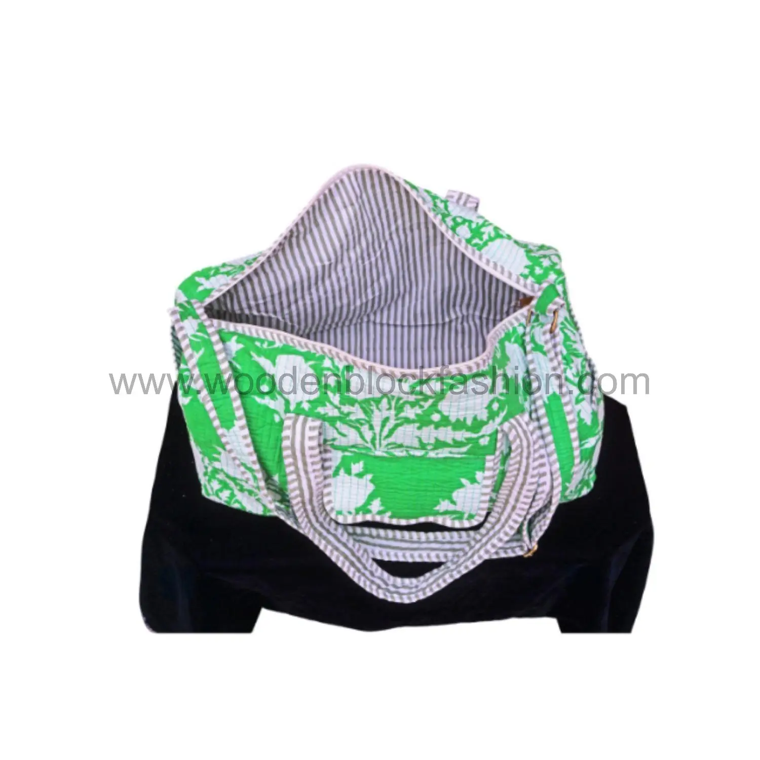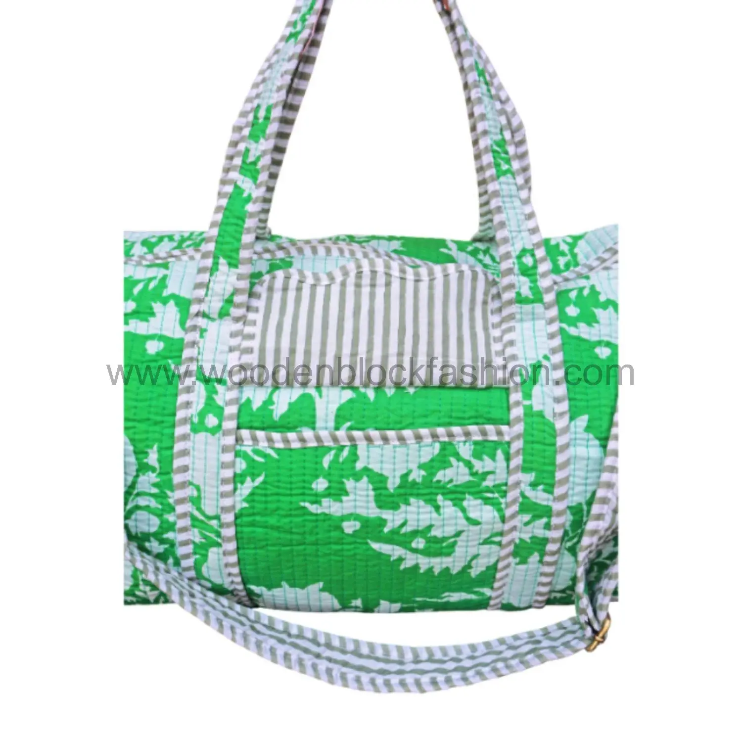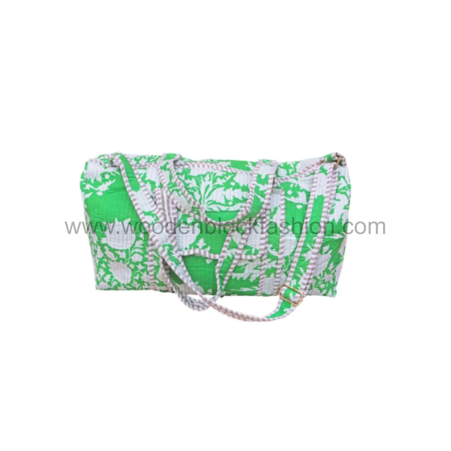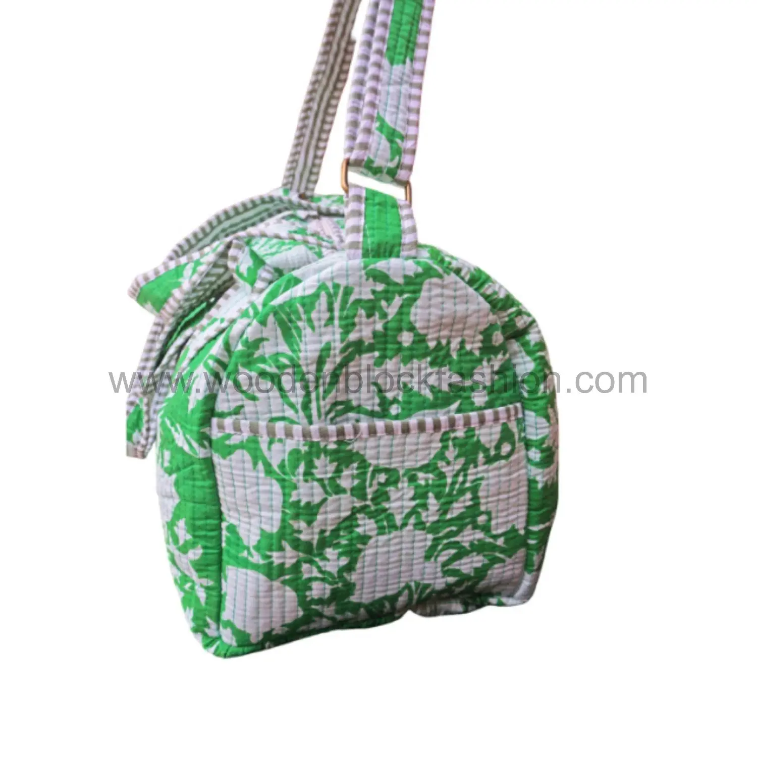 Travel chic and practical: this cotton overnight bag features quilted detailing and artisanal block printing, making it a stylish companion for women.