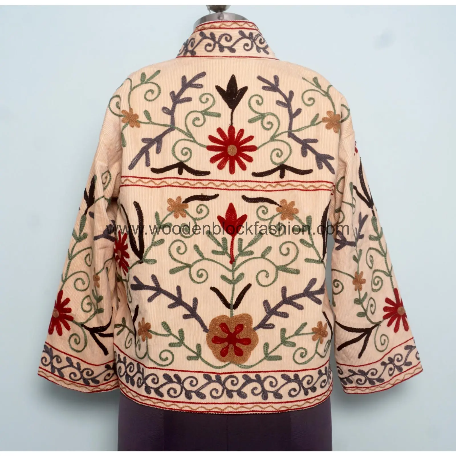 A boho luxe outerwear piece featuring detailed hand embroidery and sustainable materials.