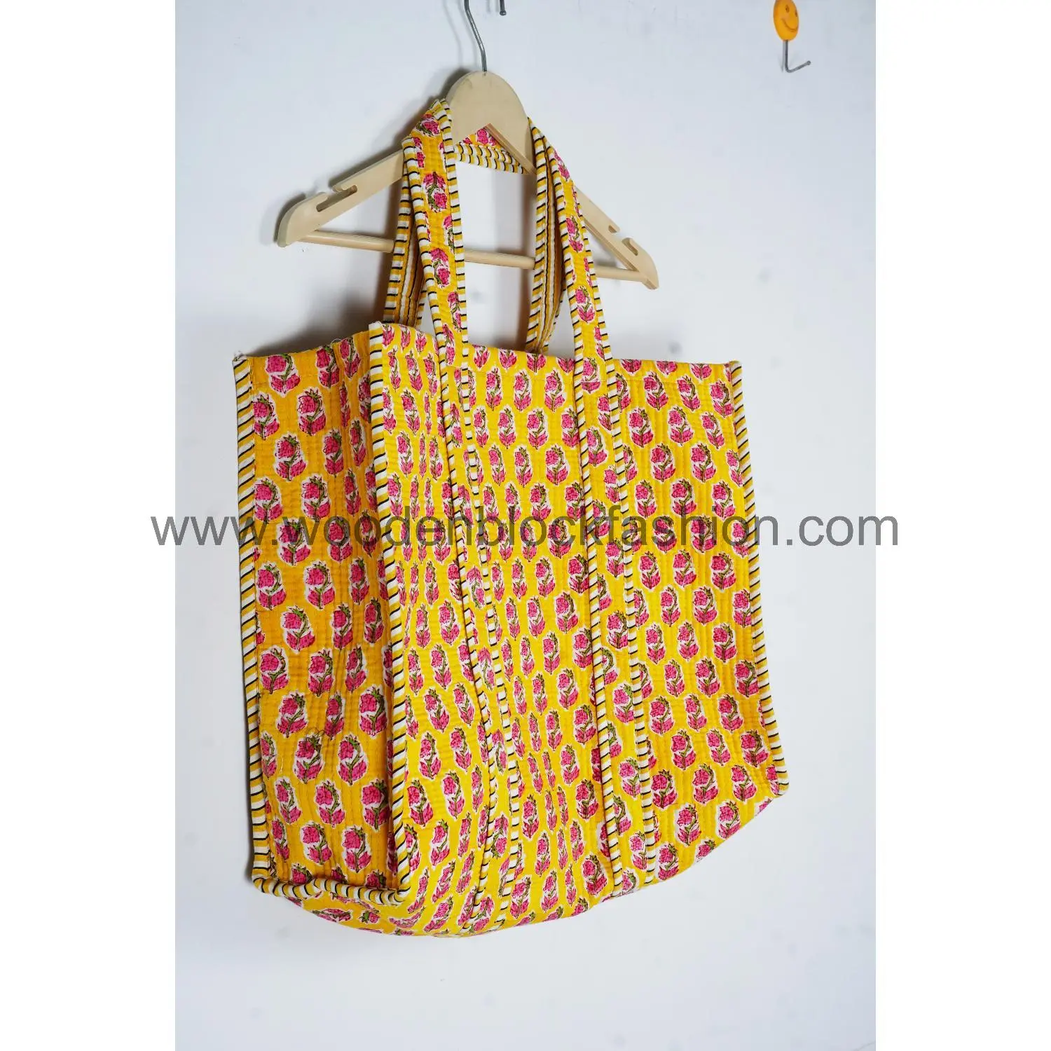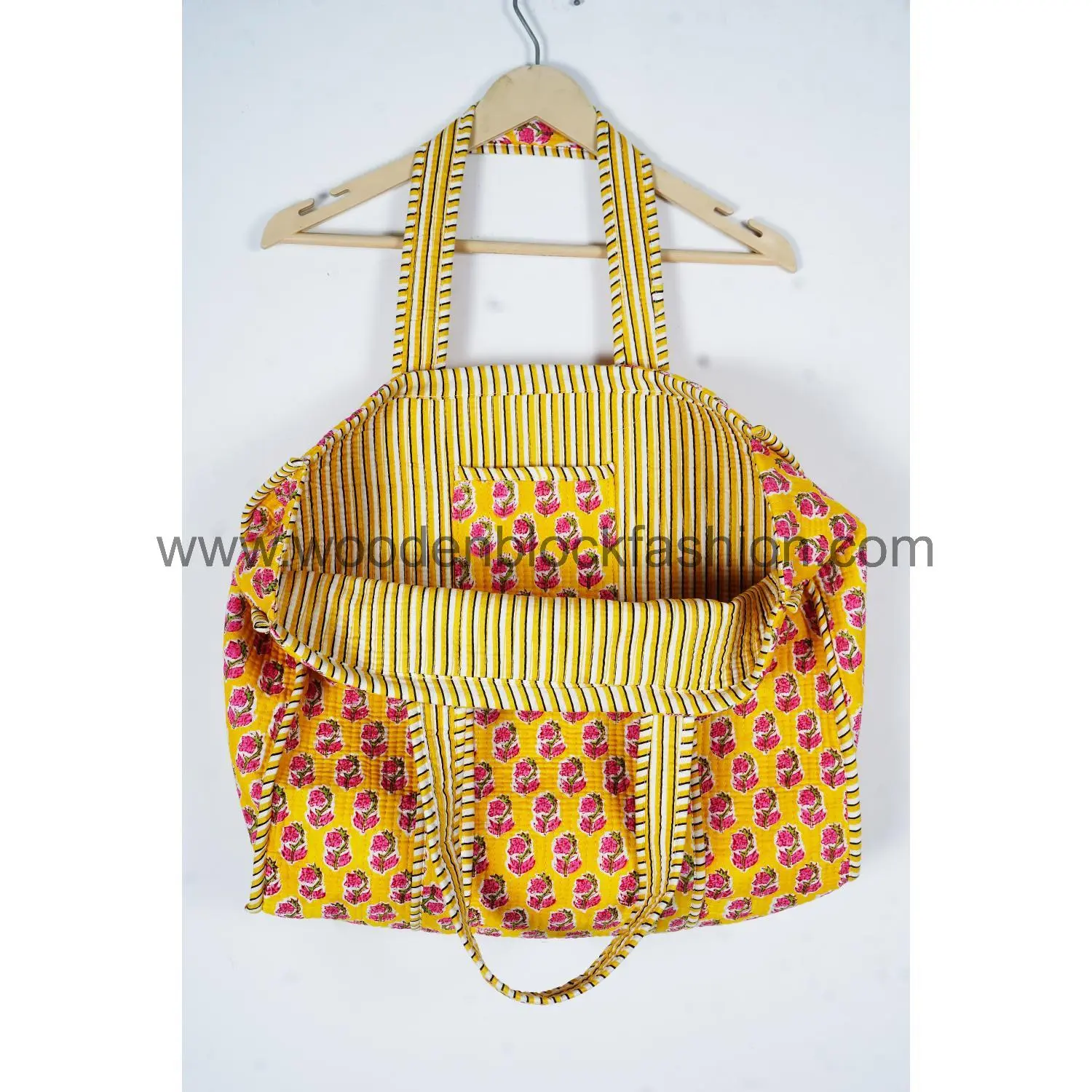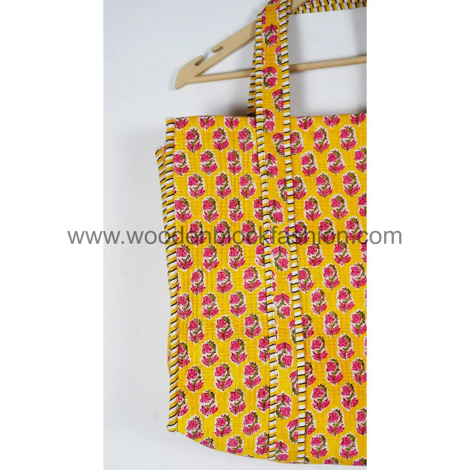 Created by Indian artisans, this quilted cotton tote bag highlights traditional hand block printed stripes while offering modern practicality for shopping and travel.