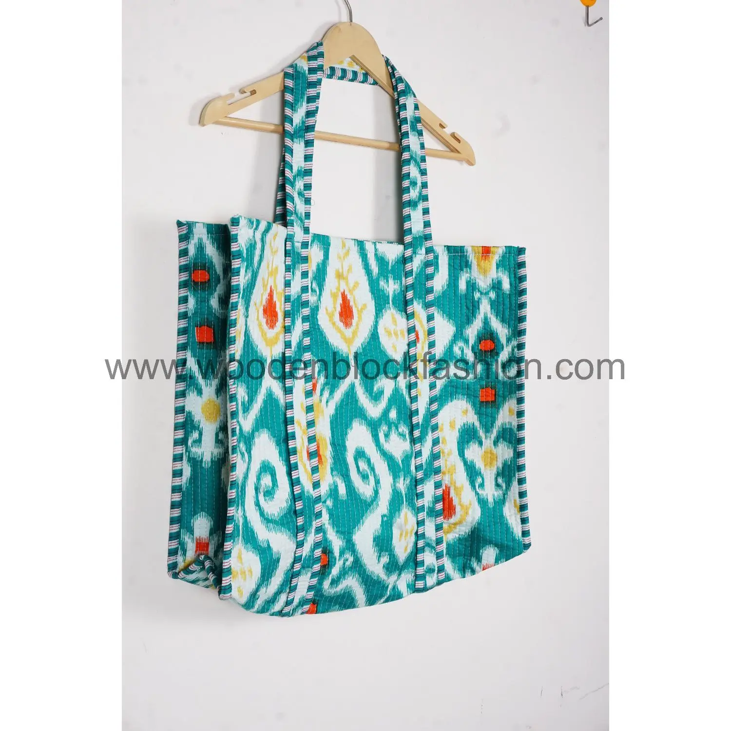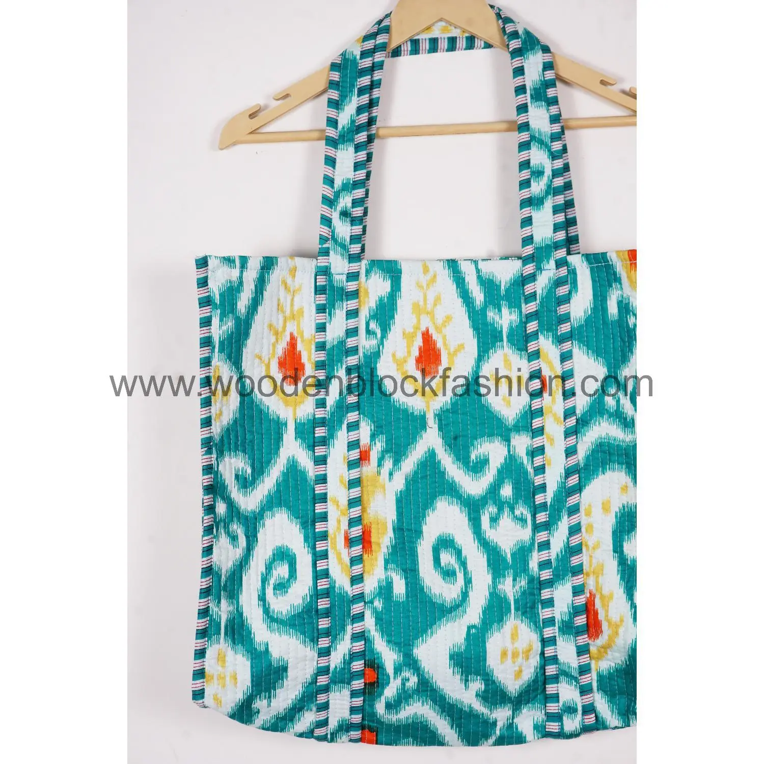 Perfect for market trips and daily errands, this Indian handmade quilted cotton tote bag features sturdy long handles and a classic striped pattern.