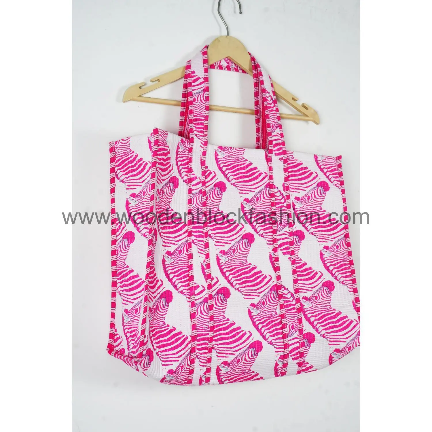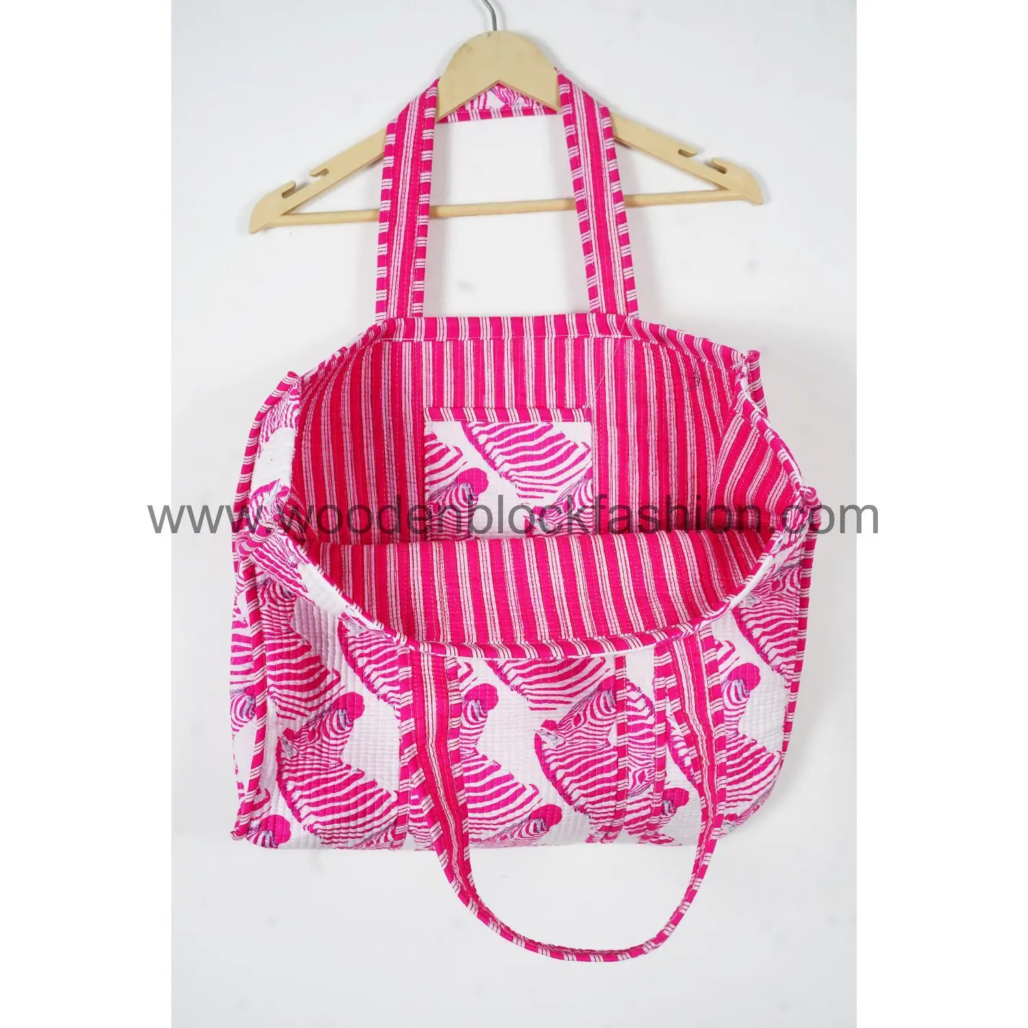 Designed for eco-conscious shoppers, this handmade quilted cotton tote bag features authentic Indian striped hand block prints and a spacious interior.
