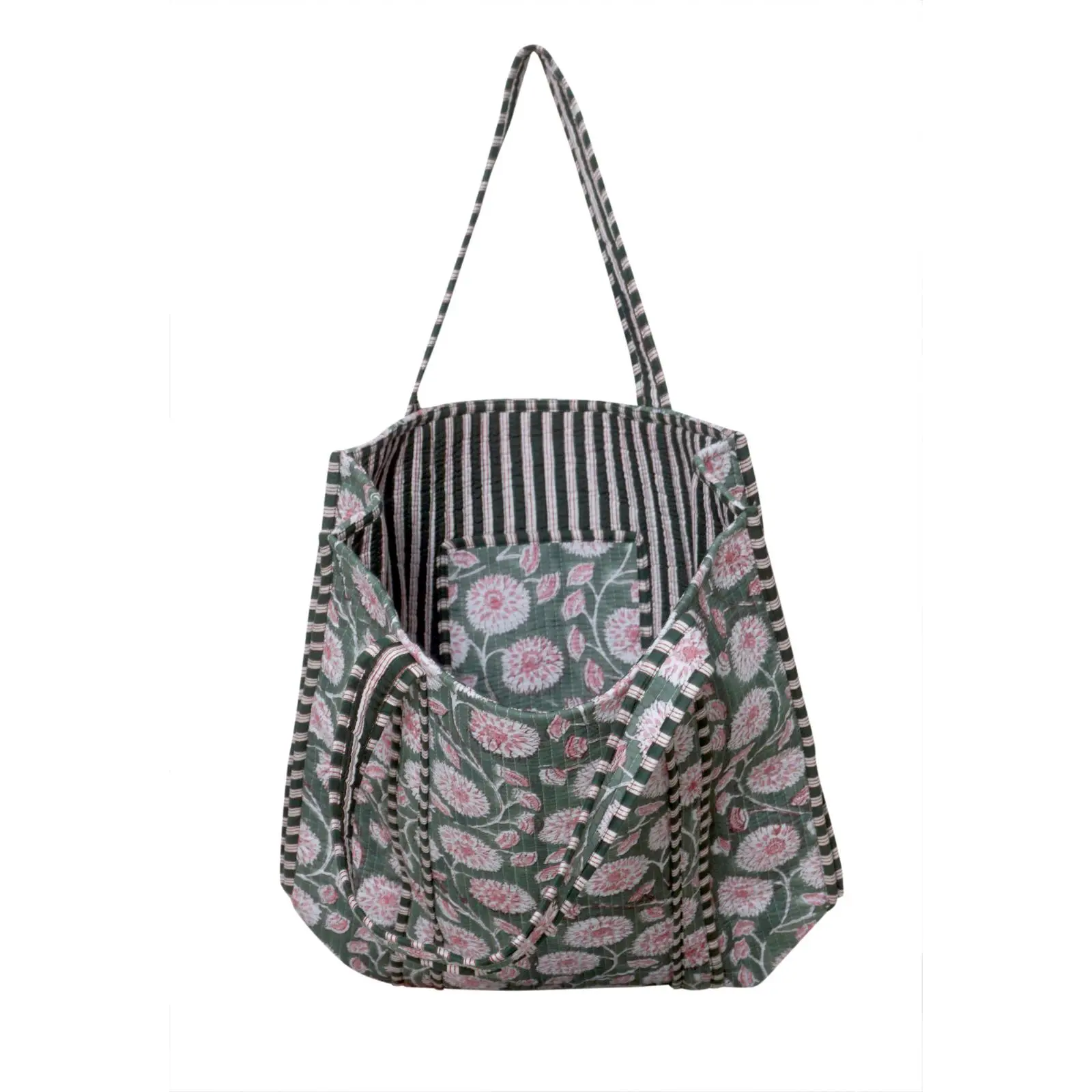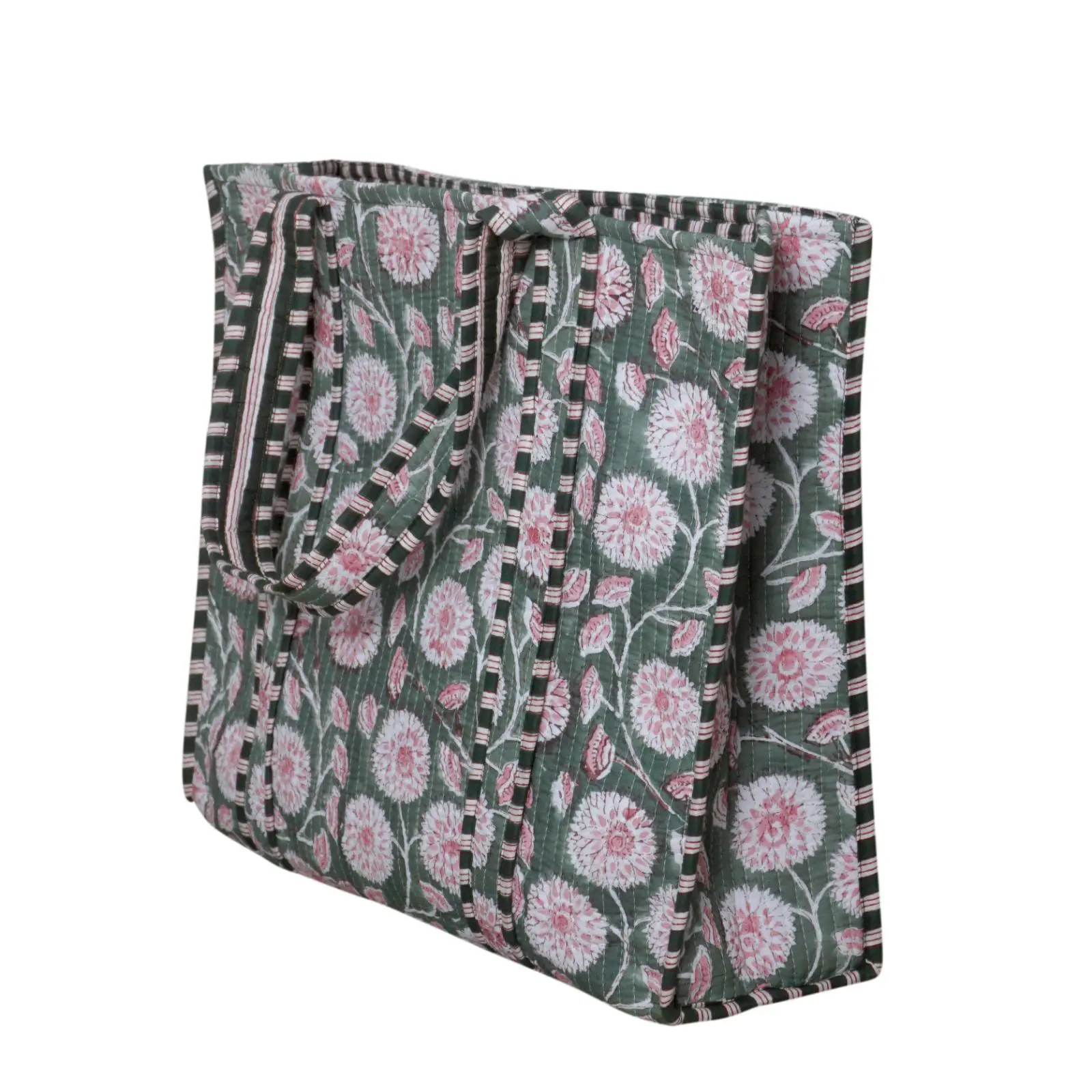 This handmade quilted cotton tote bag features a delicate pastel floral block print, making it perfect for everyday use, shopping, or gifting.