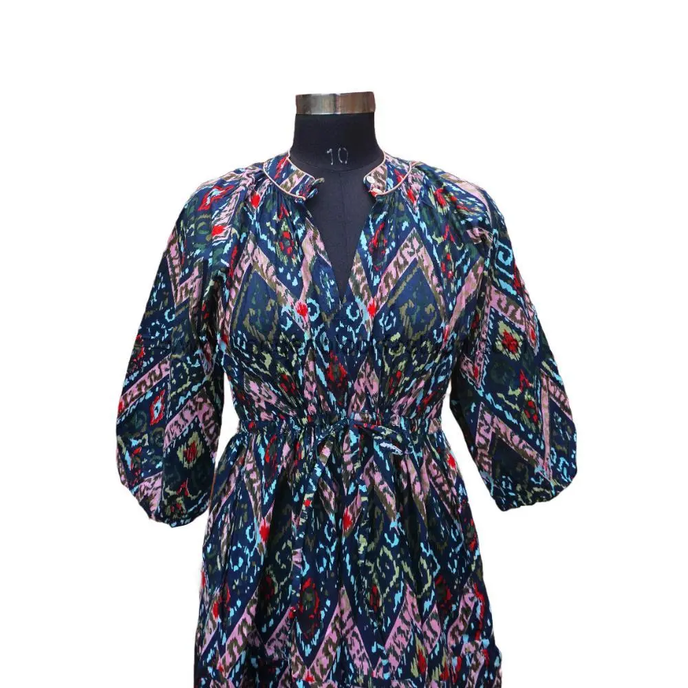 This premium cotton long dress features detailed floral block printing and a comfortable loose fit. Perfect for daily summer wear with a touch of elegance.