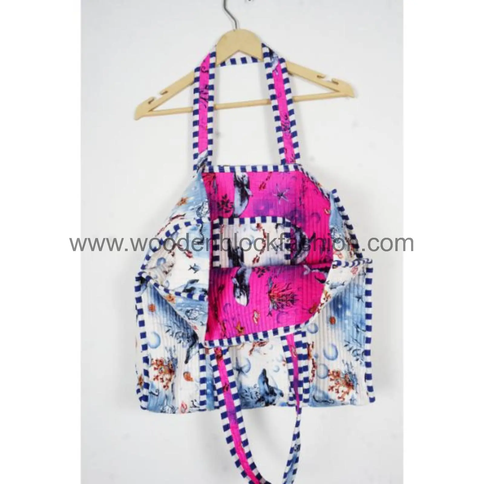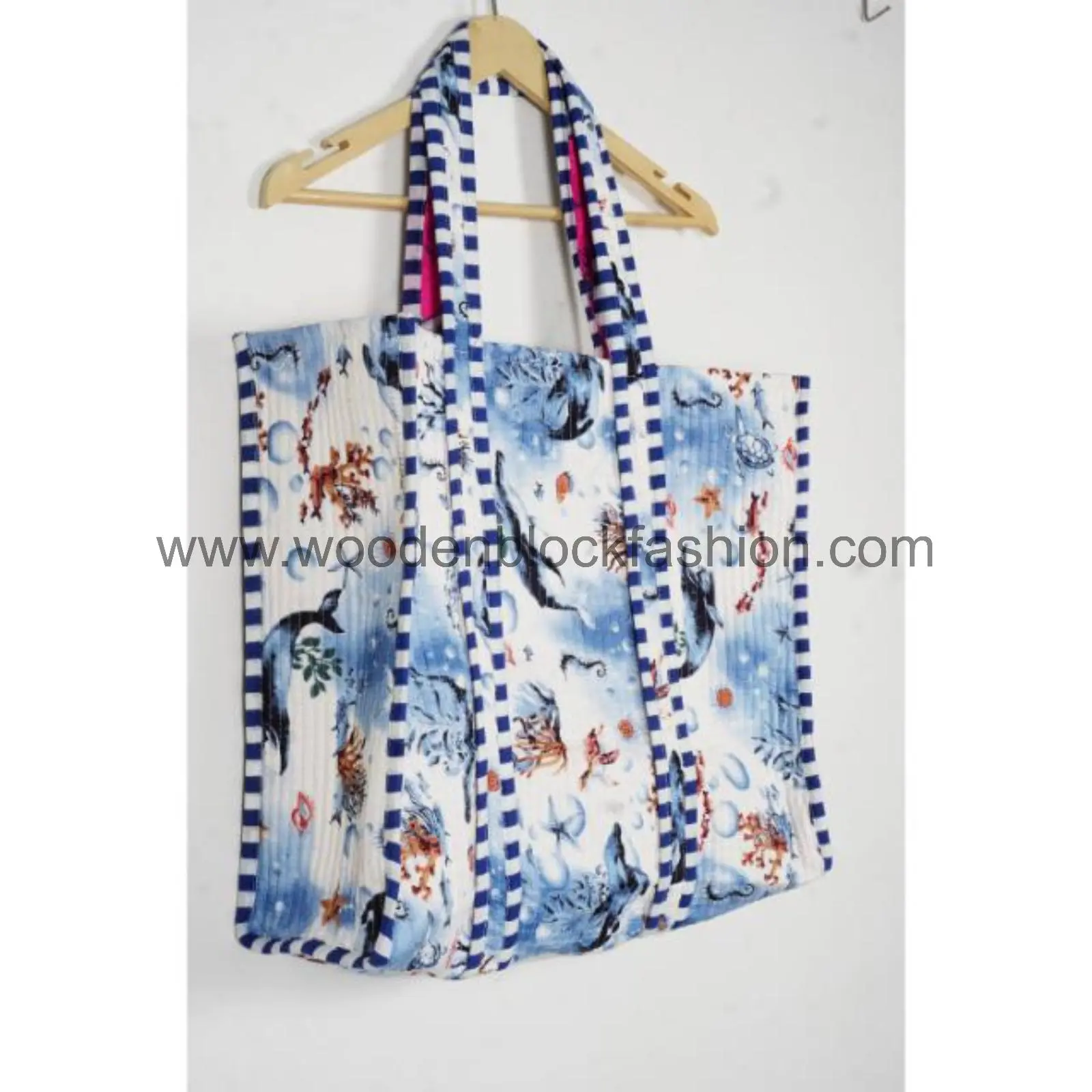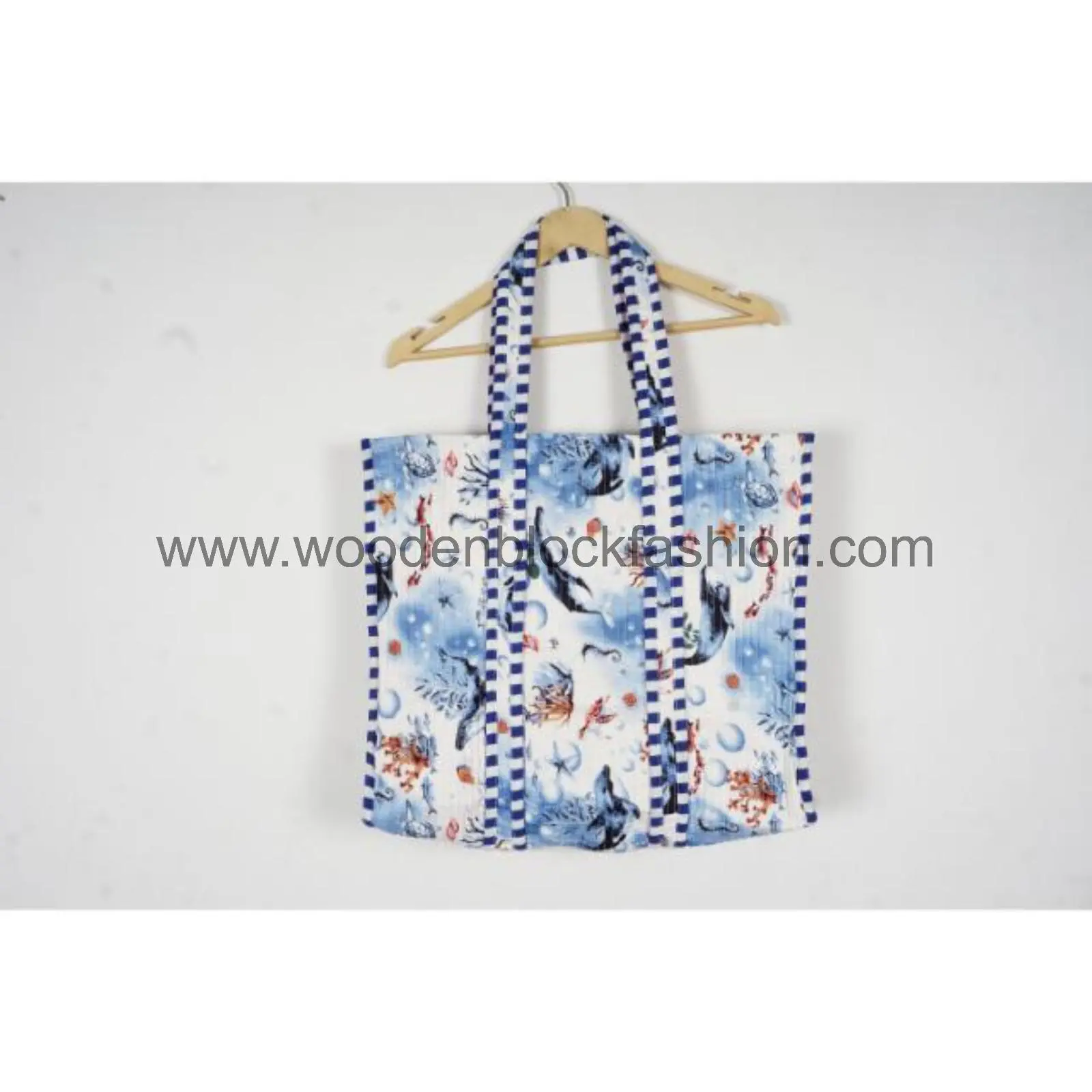 Designed for everyday shopping needs, this quilted cotton tote bag features traditional Indian hand block printing and sturdy shoulder straps for comfortable carrying.