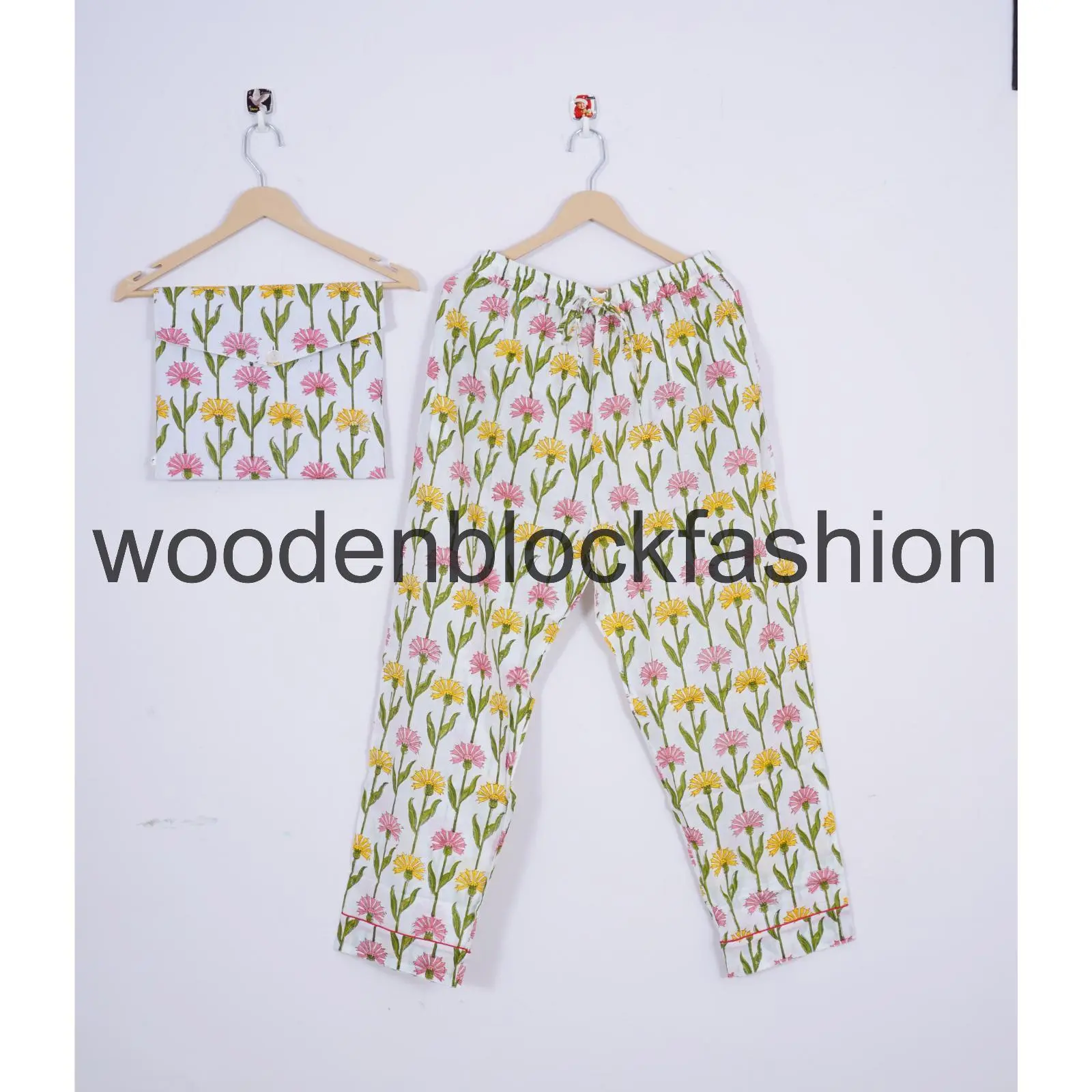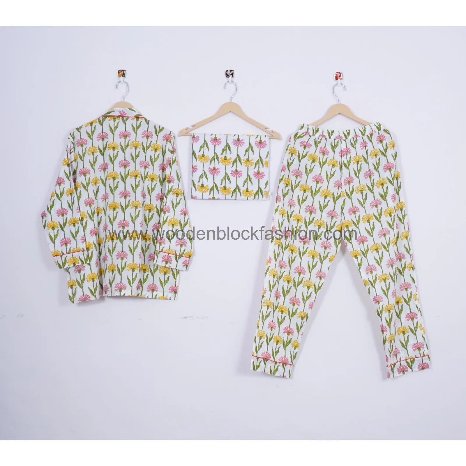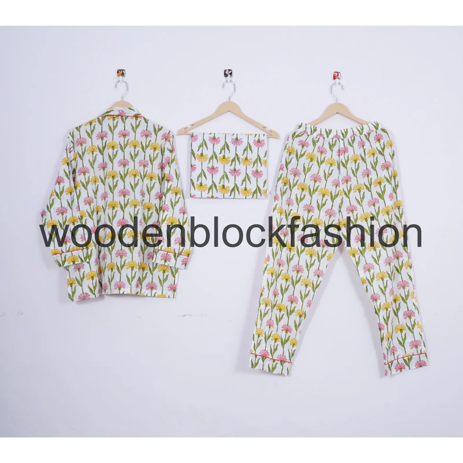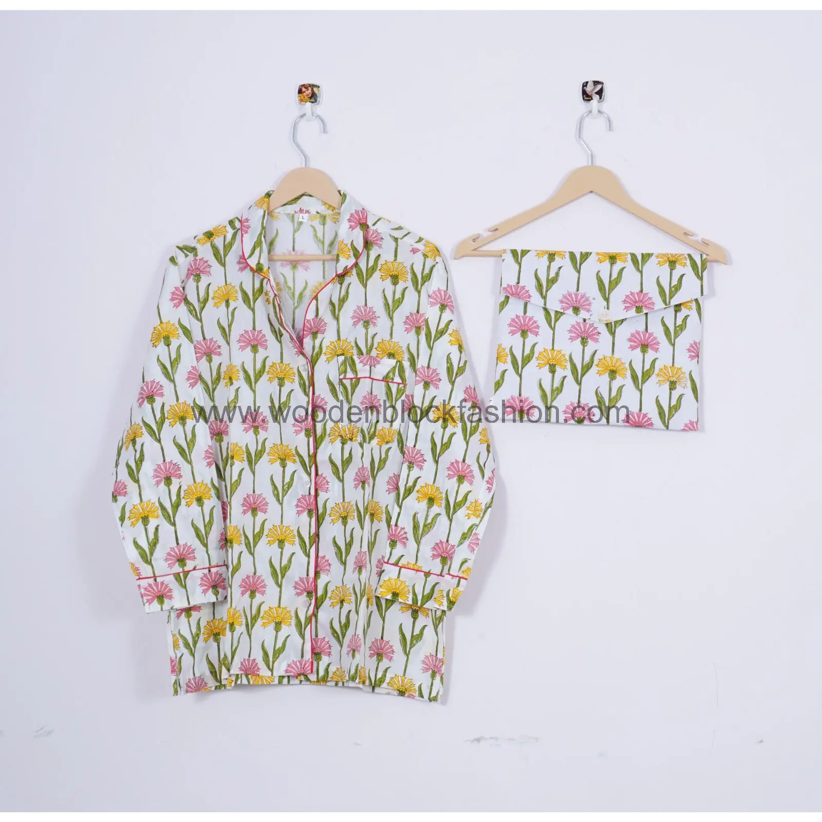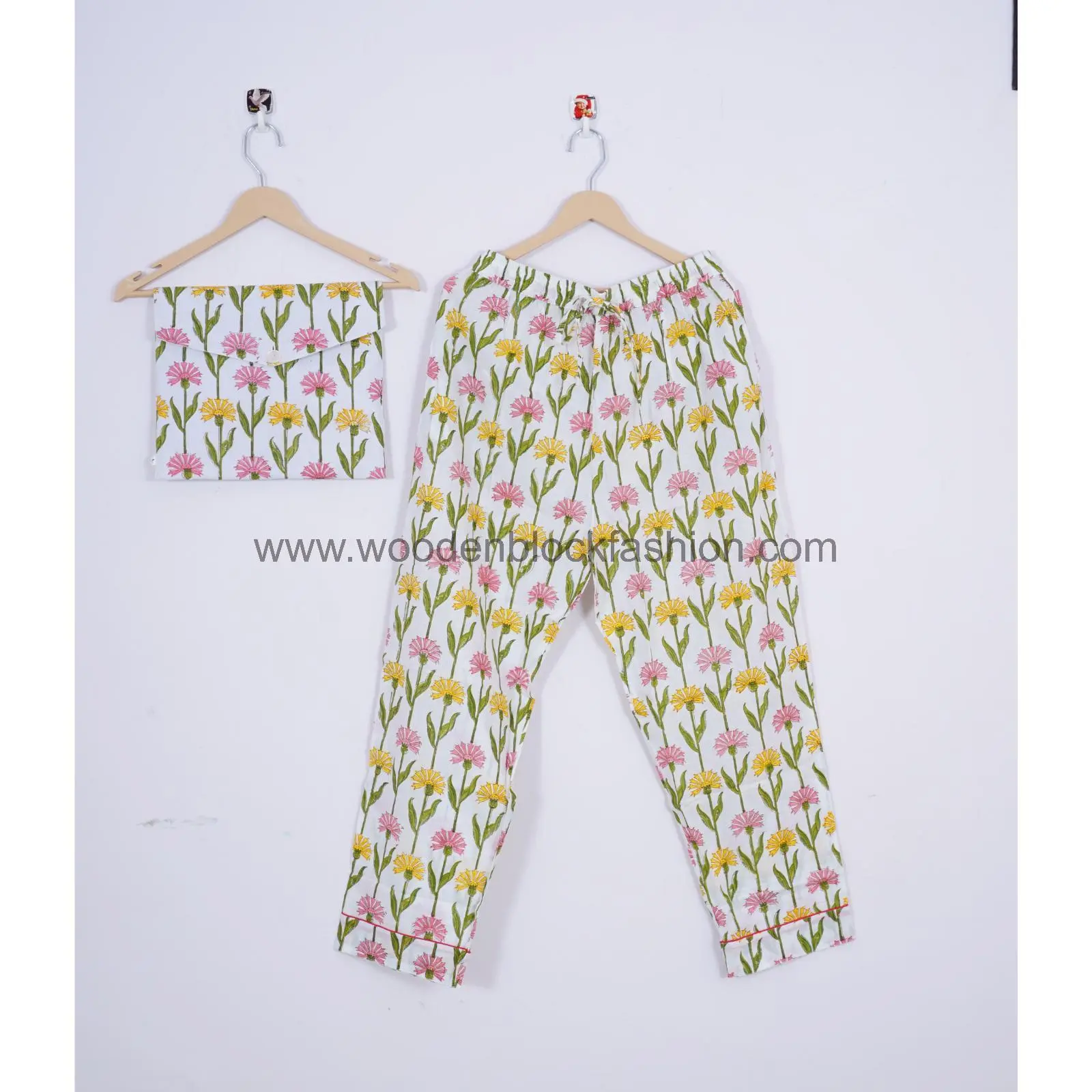 Handblock Cotton Pajama Set, Floral Print Sleepwear Loungewear