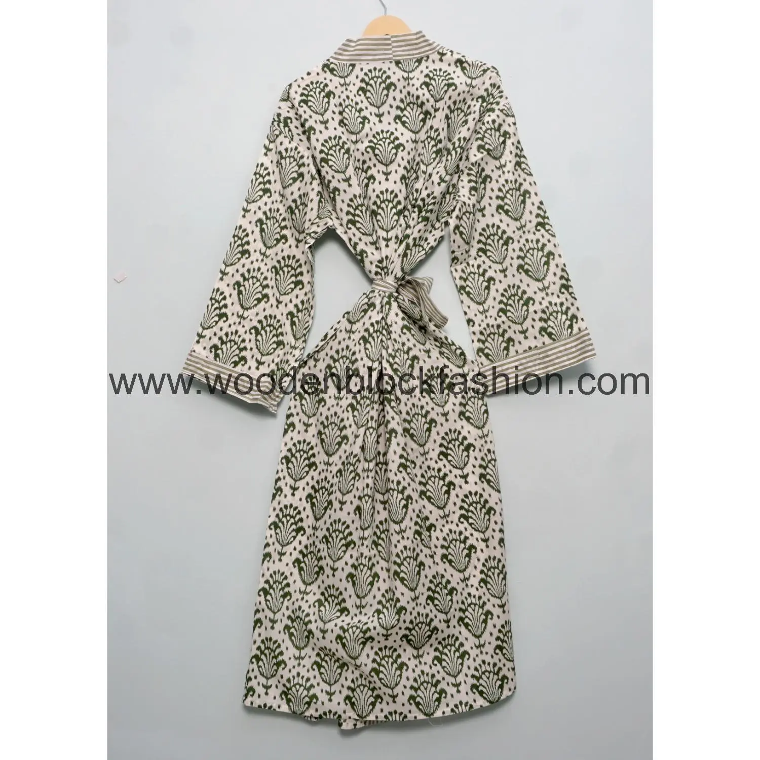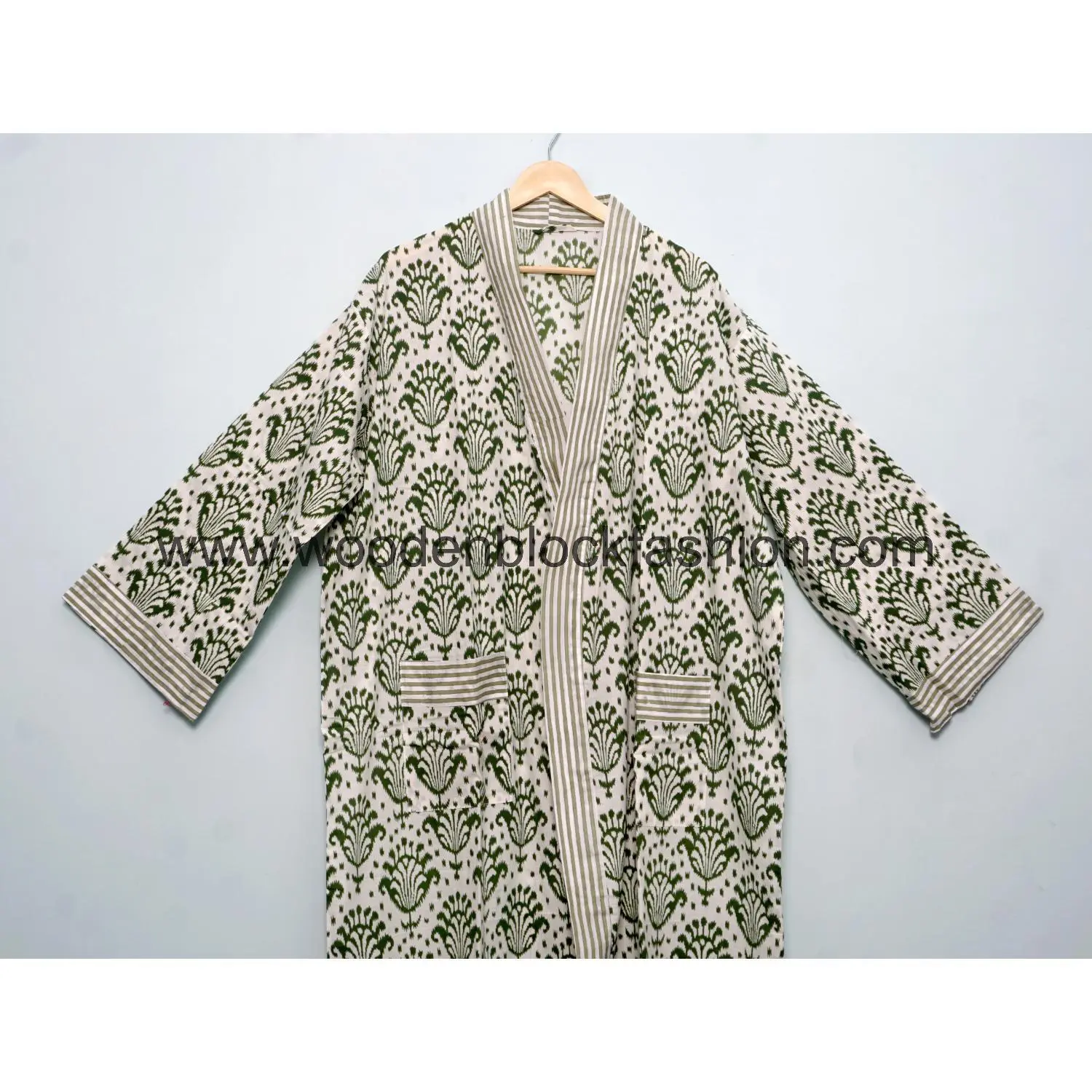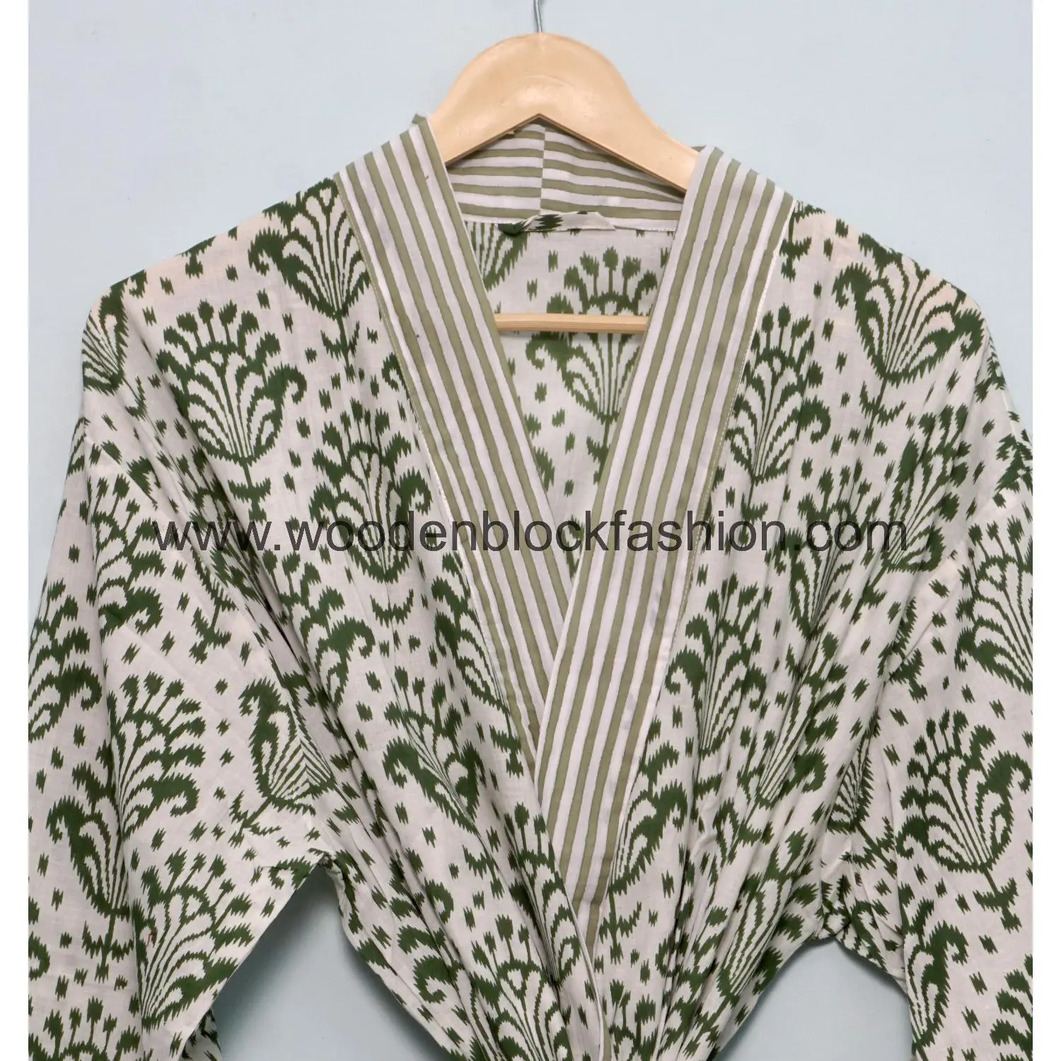 This house kimono is made from soft Indian cotton and features classic hand block printing. Ideal for everyday wear, lounging, or casual layering.