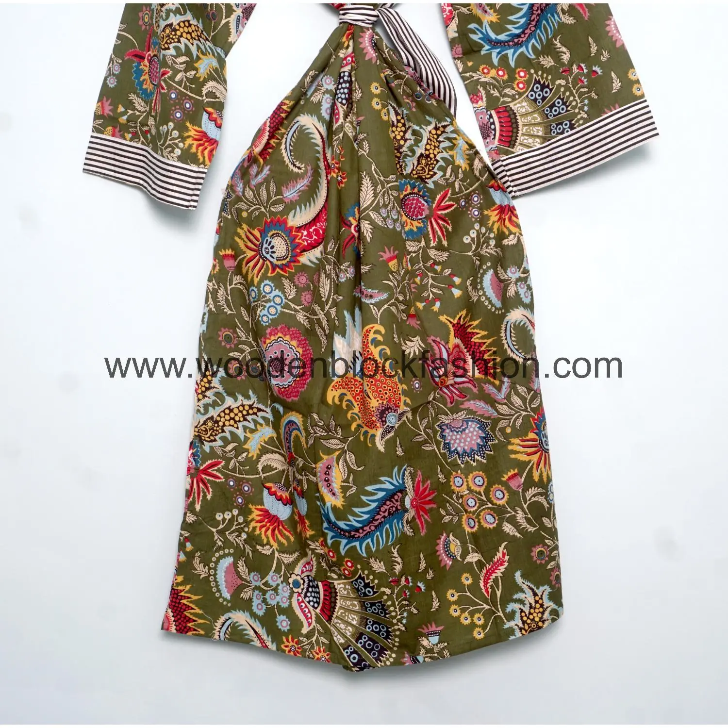 This summer cotton kimono features traditional block prints and an easy, flowy silhouette. Wear it as a beach coverup, resort wear, or casual layering piece during warm days.