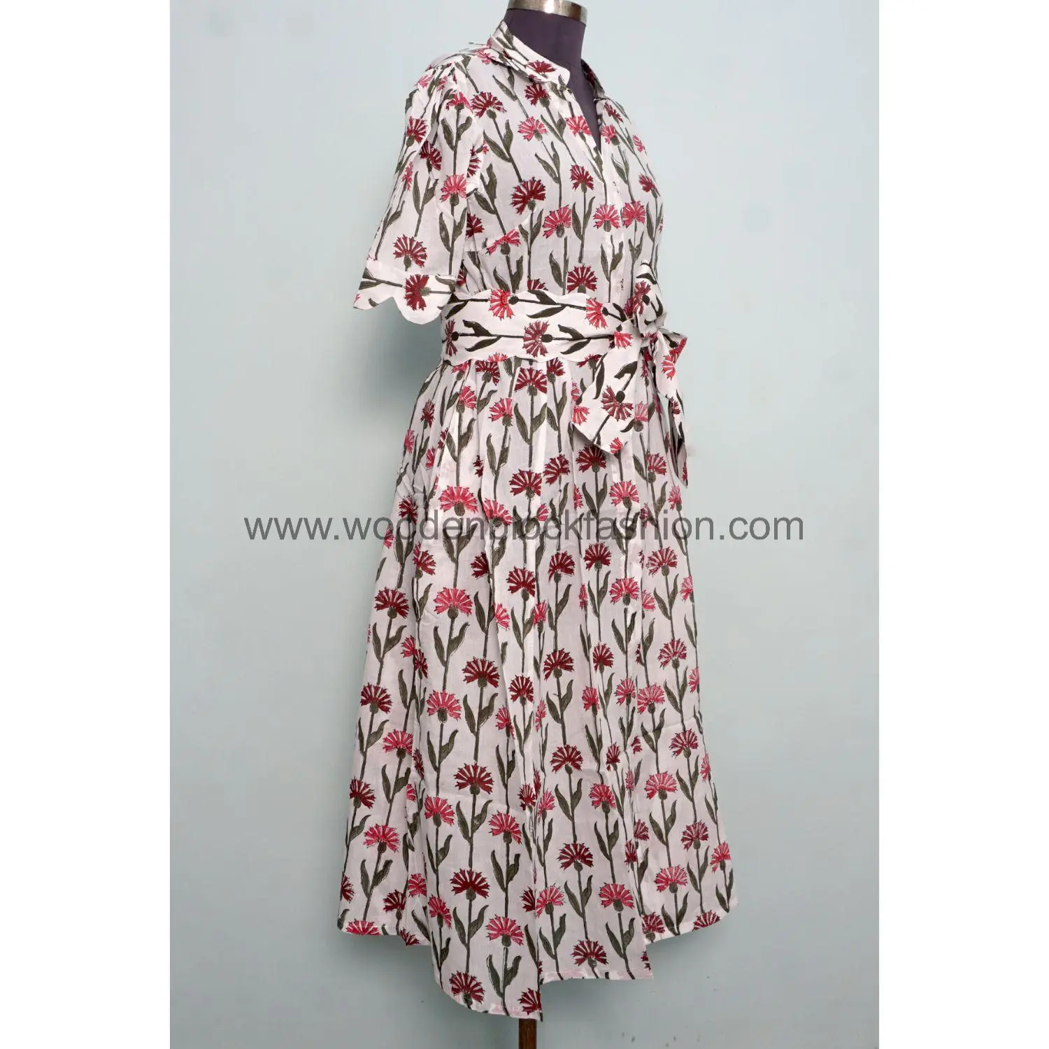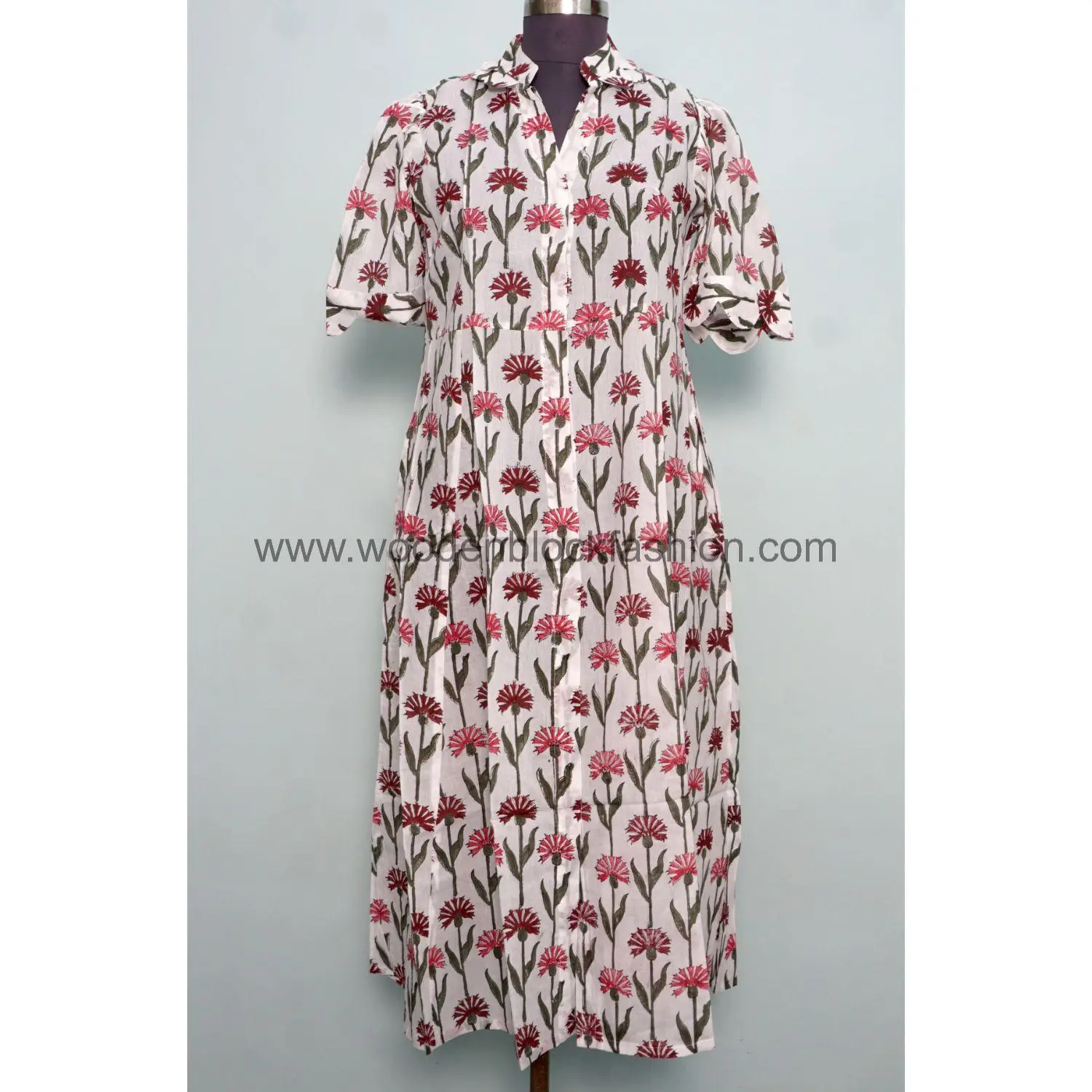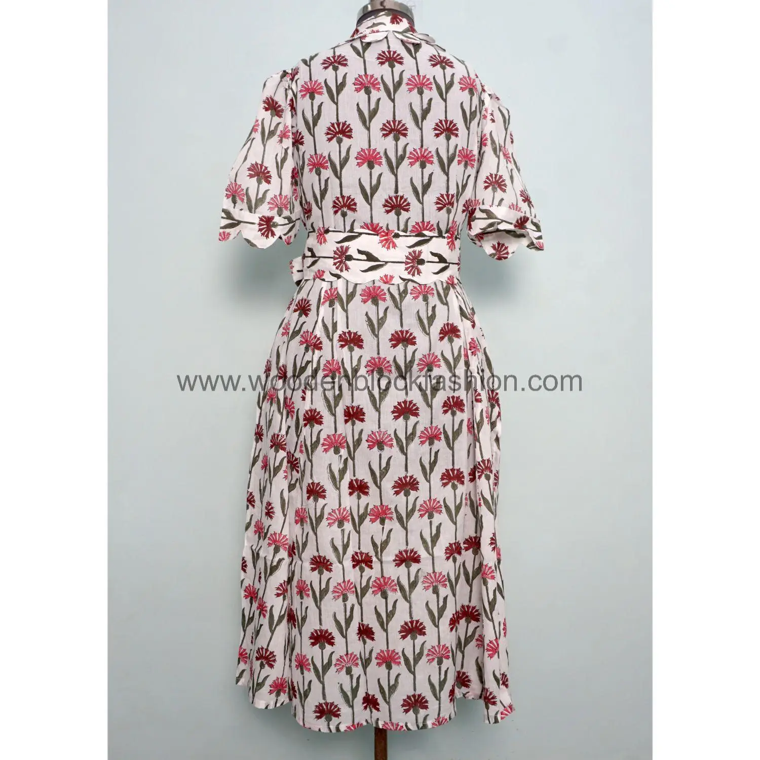 Stylish floral cotton midi dress with V-neck and short sleeves.